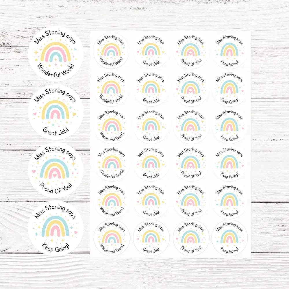 Each sticker is personalised with your name (e.g. “Miss Starling says”), creating a warm and meaningful touch that children love.
