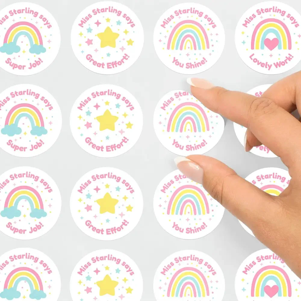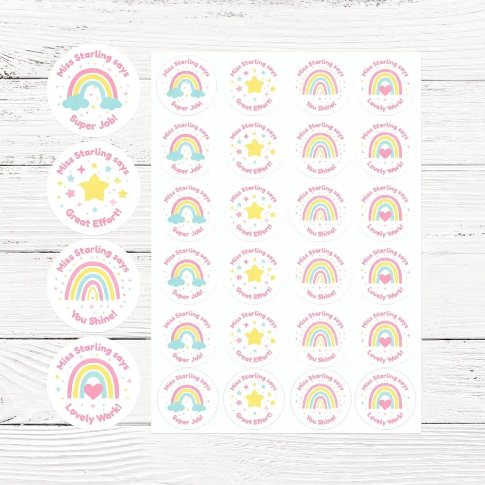Each sticker includes your personalised name (e.g. “Miss Starling says”), giving children a warm, familiar touch that makes their achievements feel extra special.