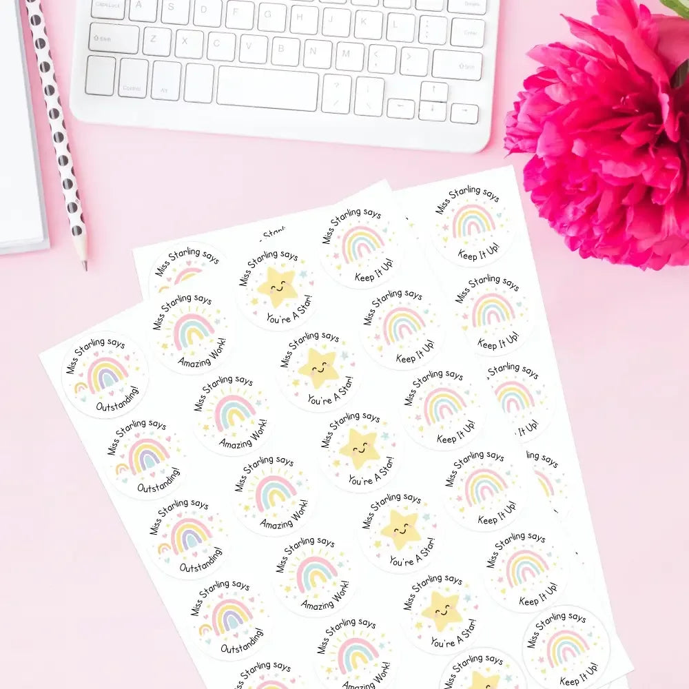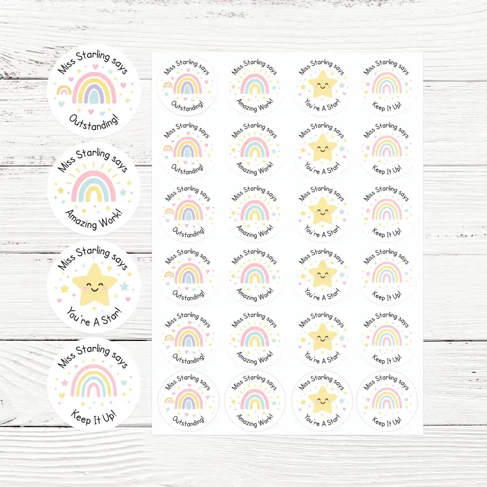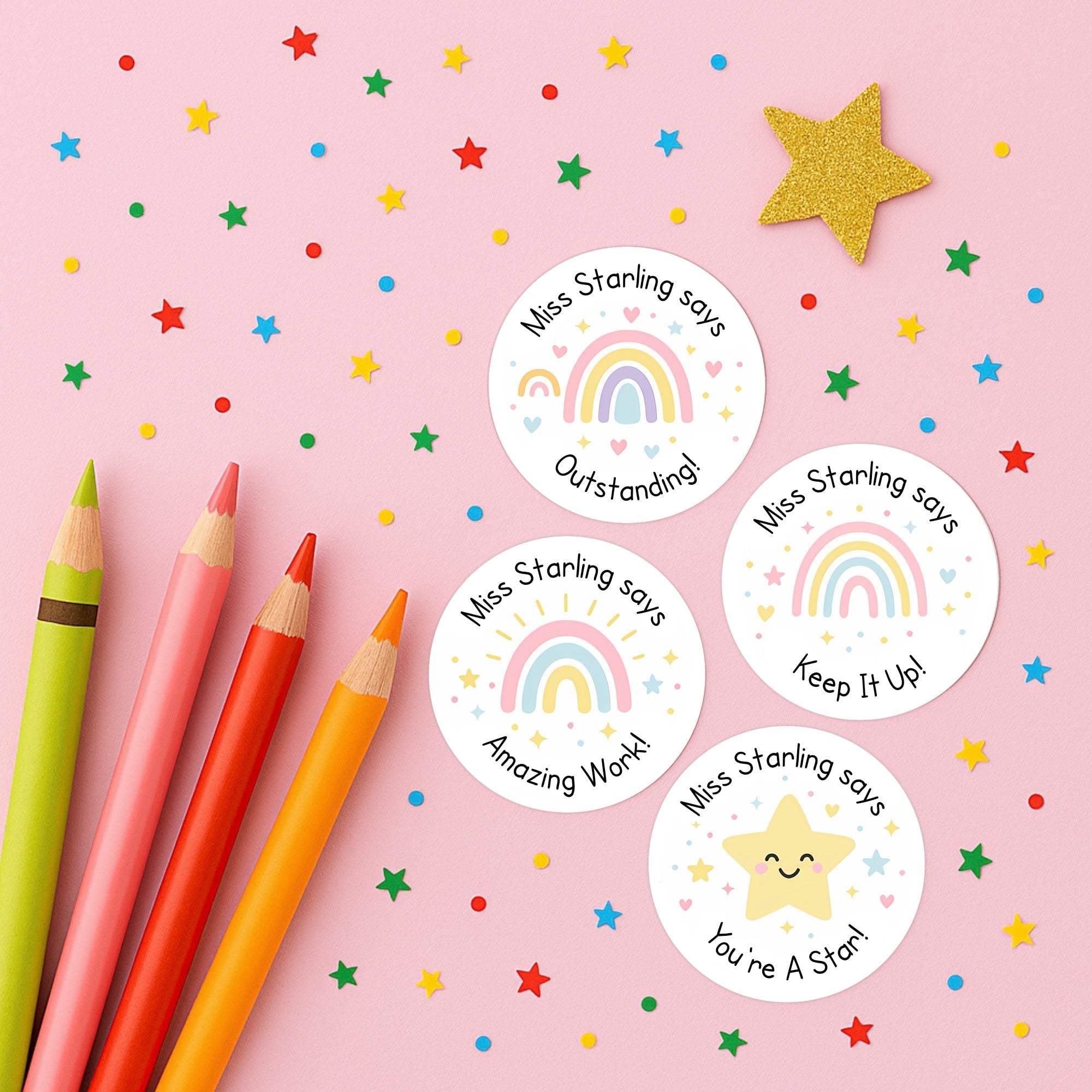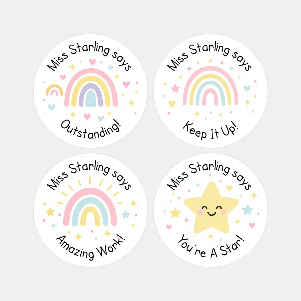 These stickers are personalised with your name (e.g. "Miss Starling says"), adding a thoughtful touch that children recognise and love.