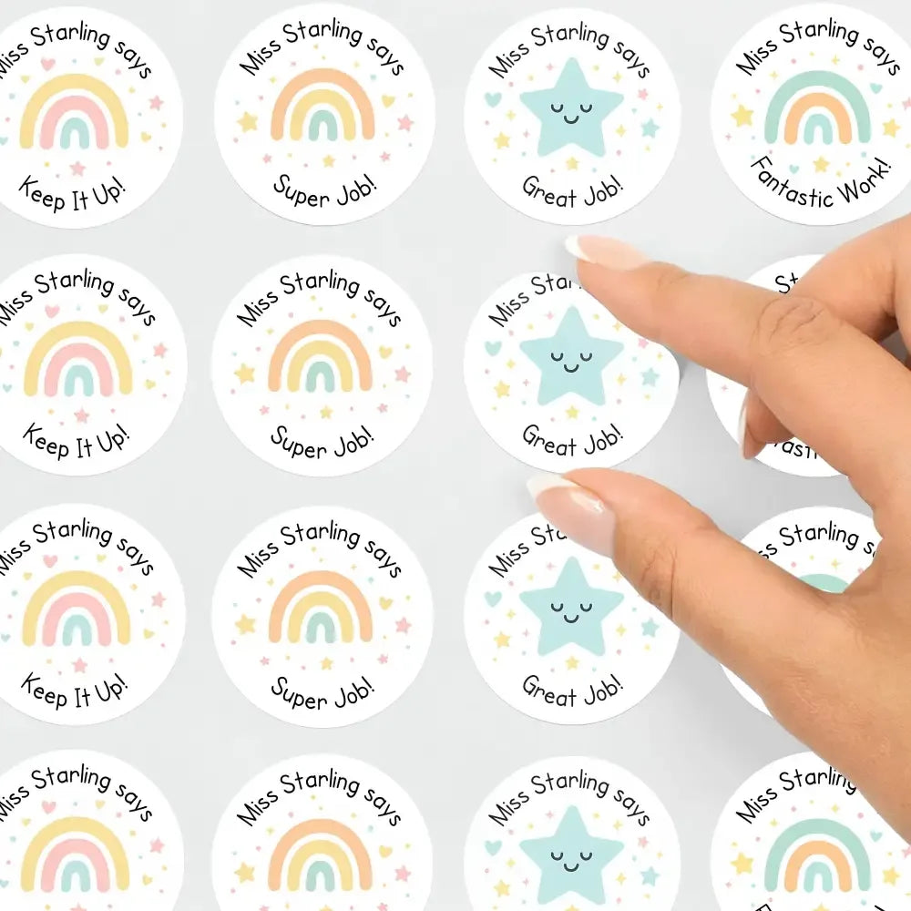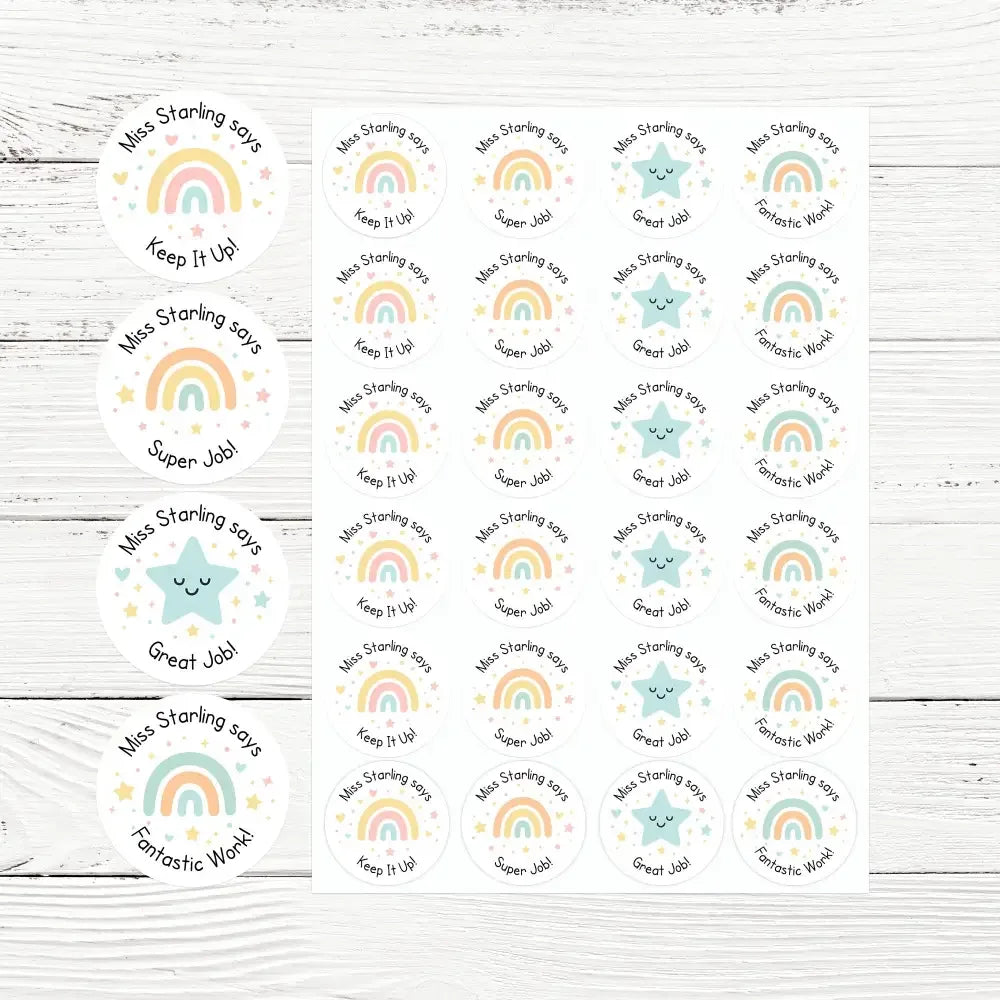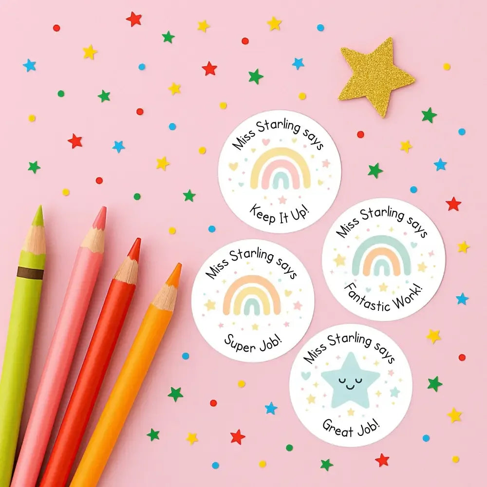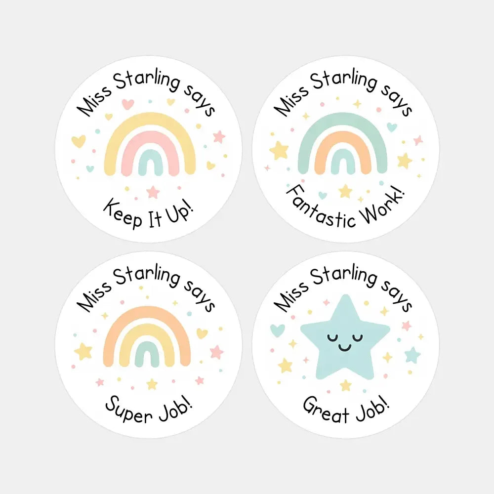 Each sticker is personalised with your name (e.g. “Miss Starling says”), creating a meaningful and motivating touch that children instantly recognise.