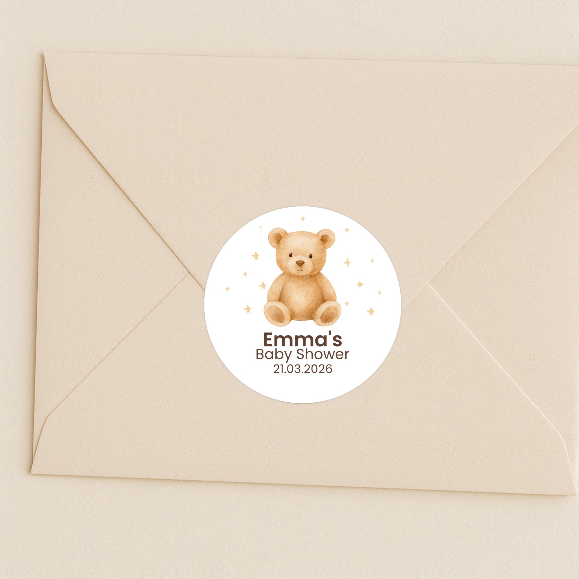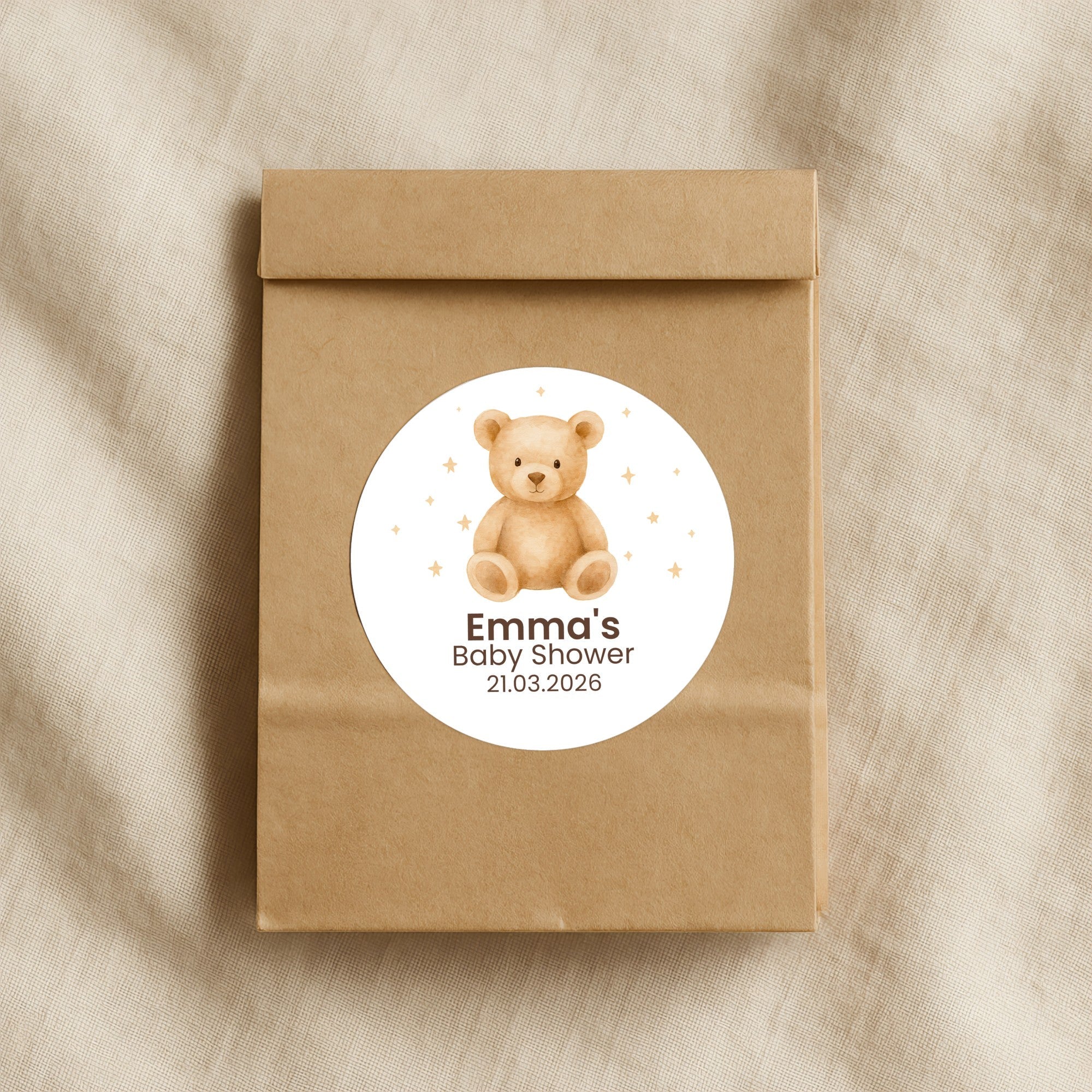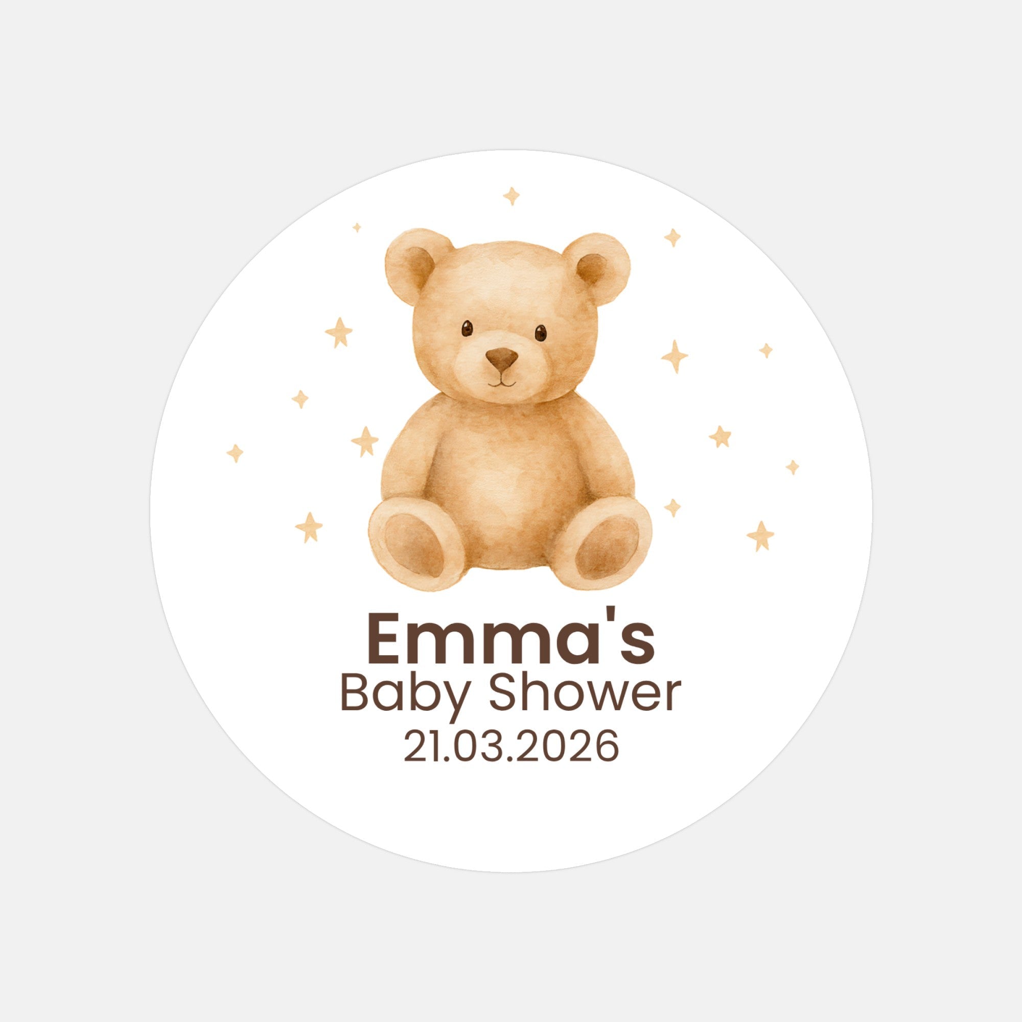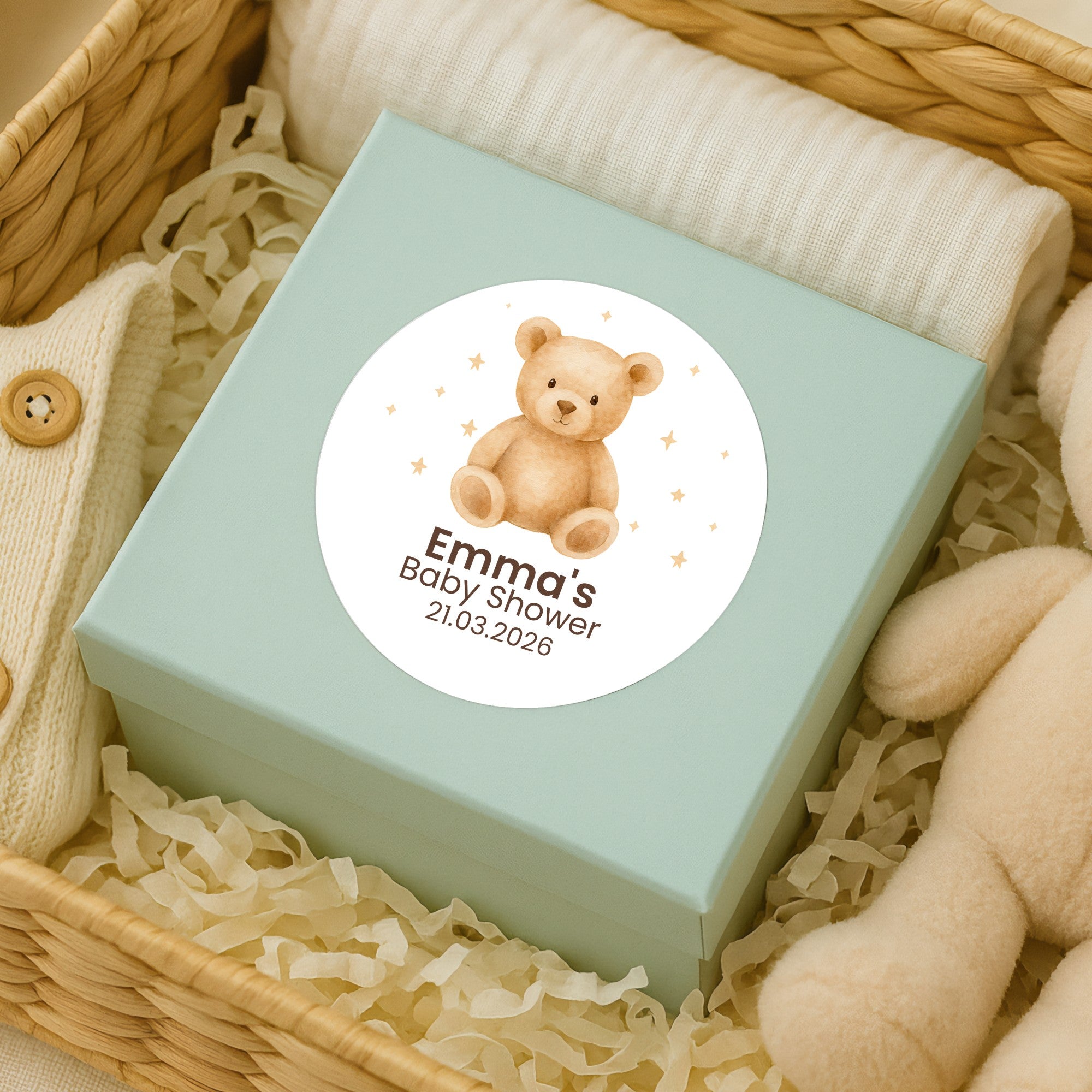 Add a sweet, gender-neutral touch to your baby shower favours with these personalised teddy bear stickers. Featuring an adorable soft watercolour teddy in warm beige tones surrounded by tiny stars, this design creates a cosy, modern and timeless look for any baby shower theme.