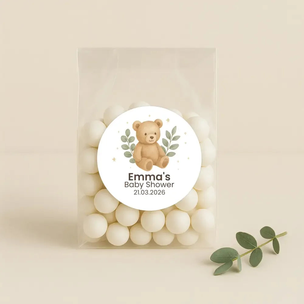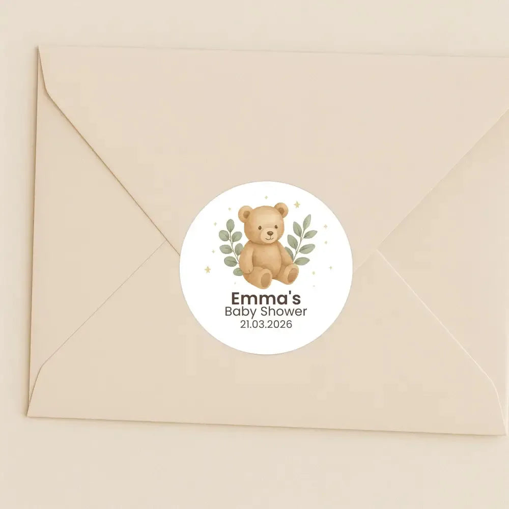 Add a sweet, nature-inspired touch to your baby shower favours with these personalised teddy bear stickers. Featuring a soft watercolour teddy in warm beige tones surrounded by gentle olive-green foliage and tiny golden stars, this charming design brings a calm, modern and gender-neutral feel to any celebration.