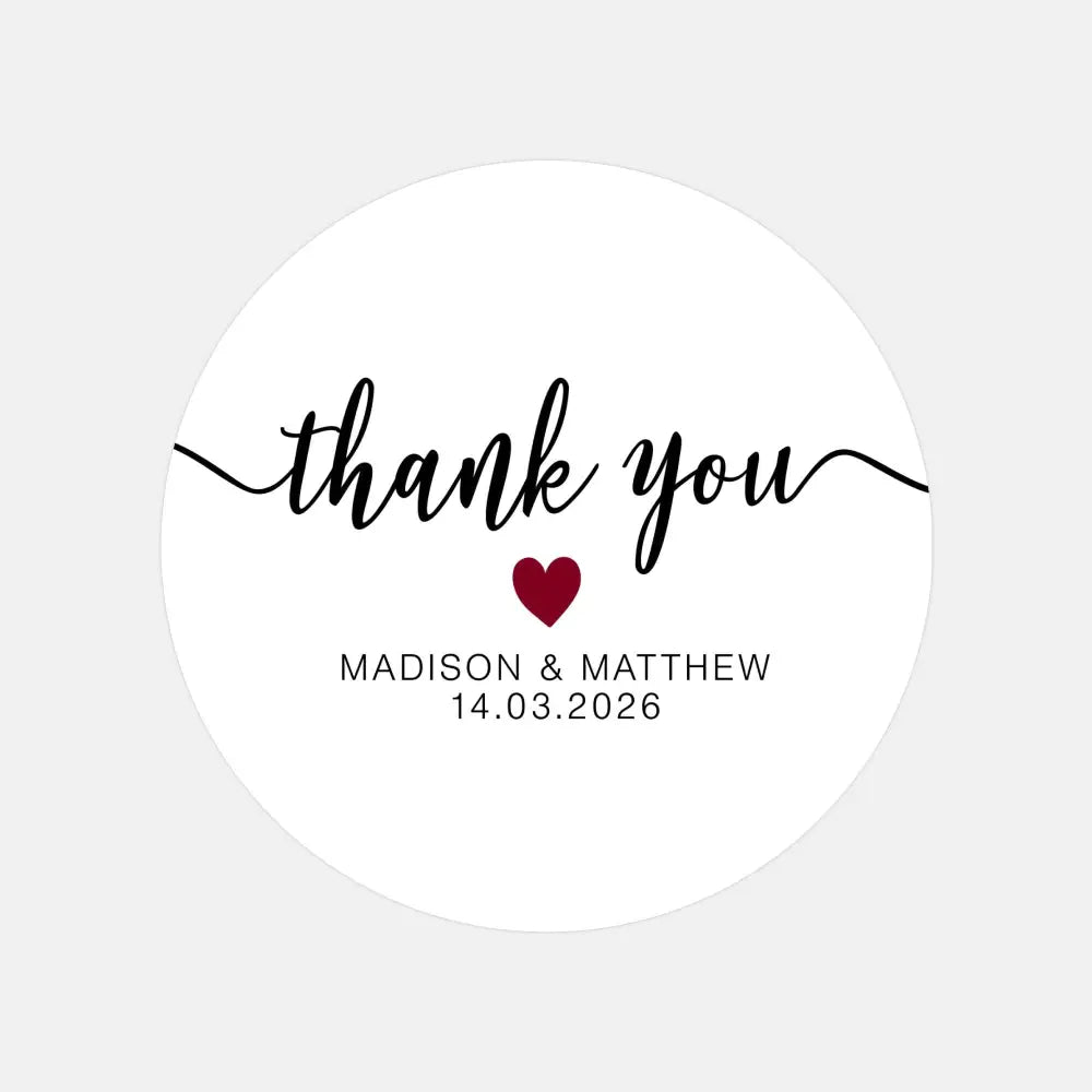 Add a touch of classic elegance to your wedding favours with these personalised thank-you stickers, featuring a sleek black script and a deep burgundy heart accent. Perfect for sealing envelopes, decorating bonbonniere, or finishing off gift bags, these stickers bring sophistication and love to every detail of your special day.