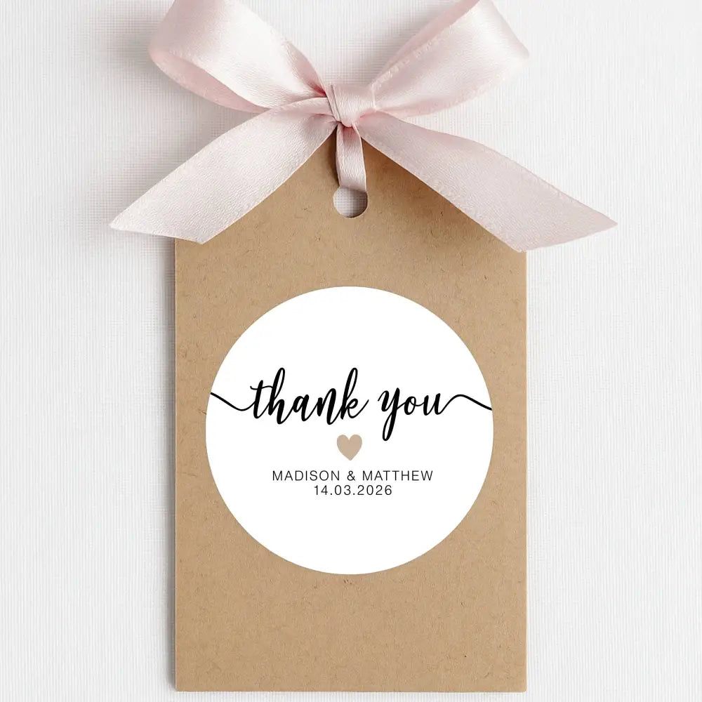 Add a warm and sophisticated finishing touch to your wedding favours with these personalised thank-you stickers featuring an elegant taupe heart and flowing black script. Perfect for sealing invitations, decorating bonbonniere, or adding a timeless accent to your special day.