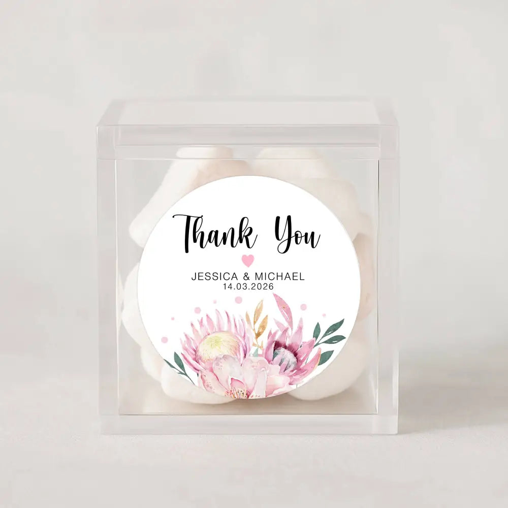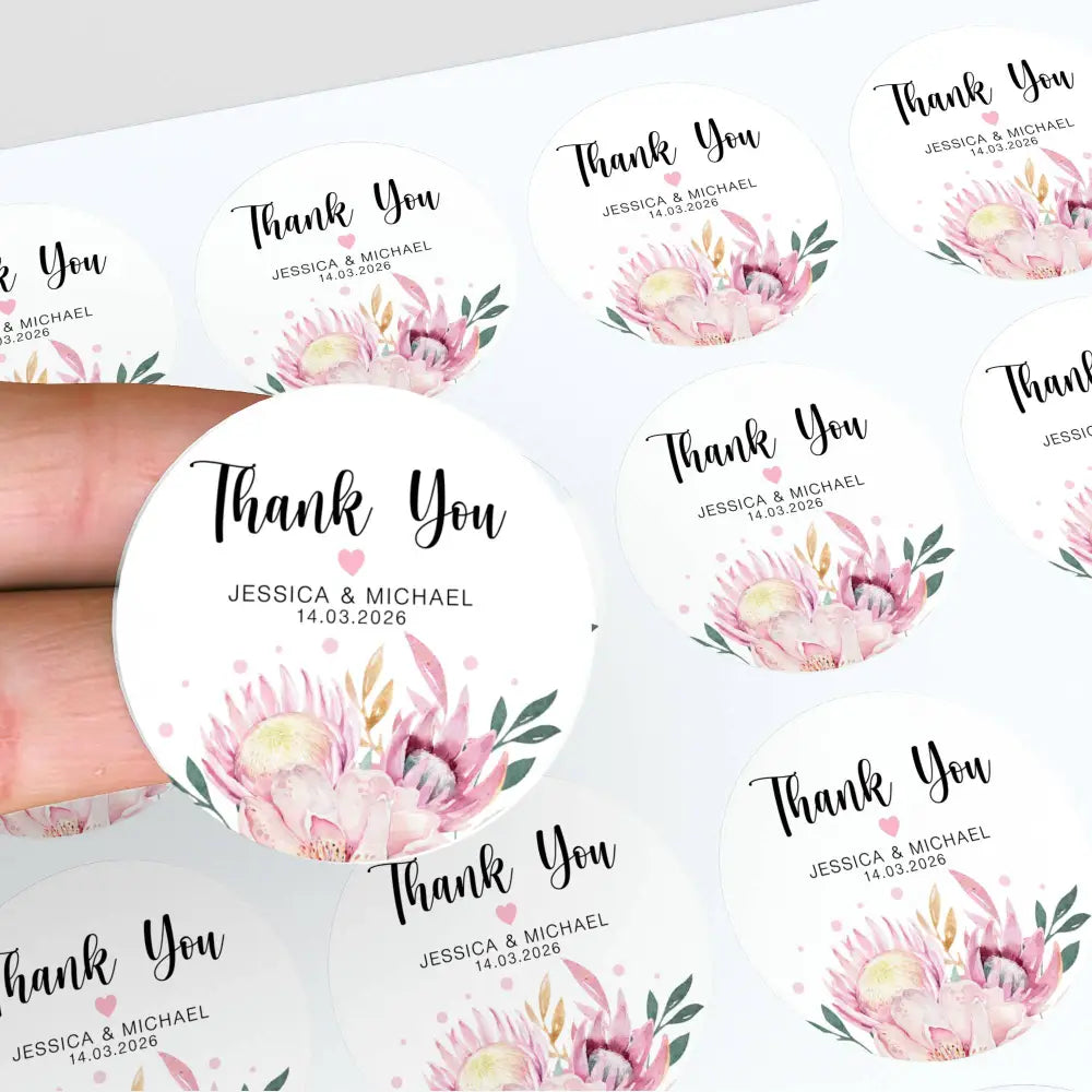Add a beautiful finishing touch to your wedding favours with these personalised thank-you stickers, featuring a stunning pink protea floral arrangement with soft blush accents and elegant black typography. Perfect for sealing invitation envelopes, decorating bonbonniere, or styling gift packaging for your special day.