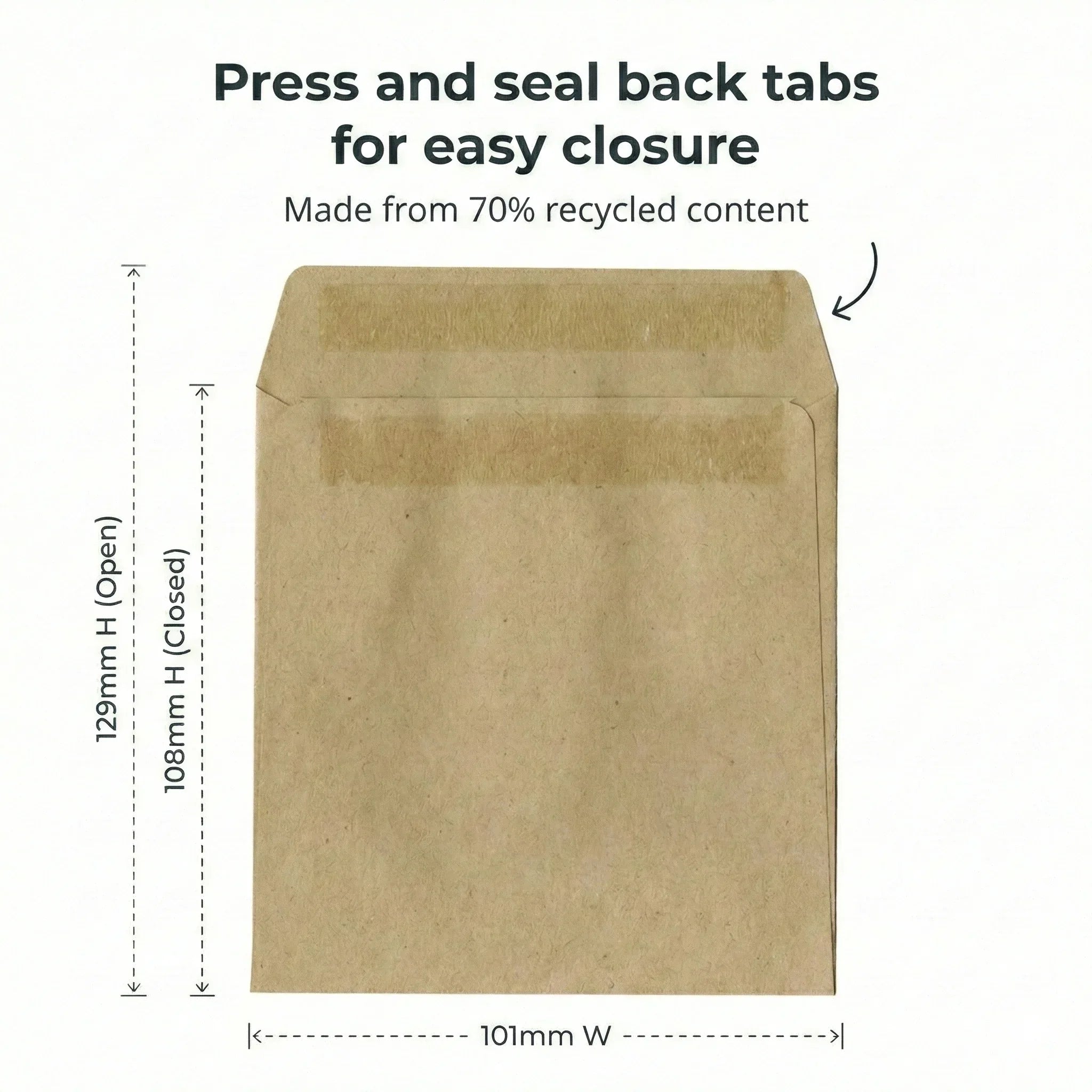 Closure: Press & seal back tabs (no lick-and-stick)
