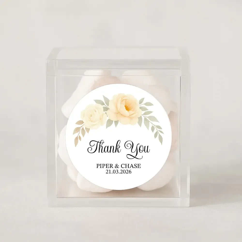 Add a soft, timeless elegance to your wedding favours with these personalised butter-cream and ivory rose Thank You stickers. Featuring a delicate floral arrangement of warm cream roses, soft ivory blooms and muted sage greenery, this design creates a gentle, romantic look perfect for any classic or garden-inspired wedding.