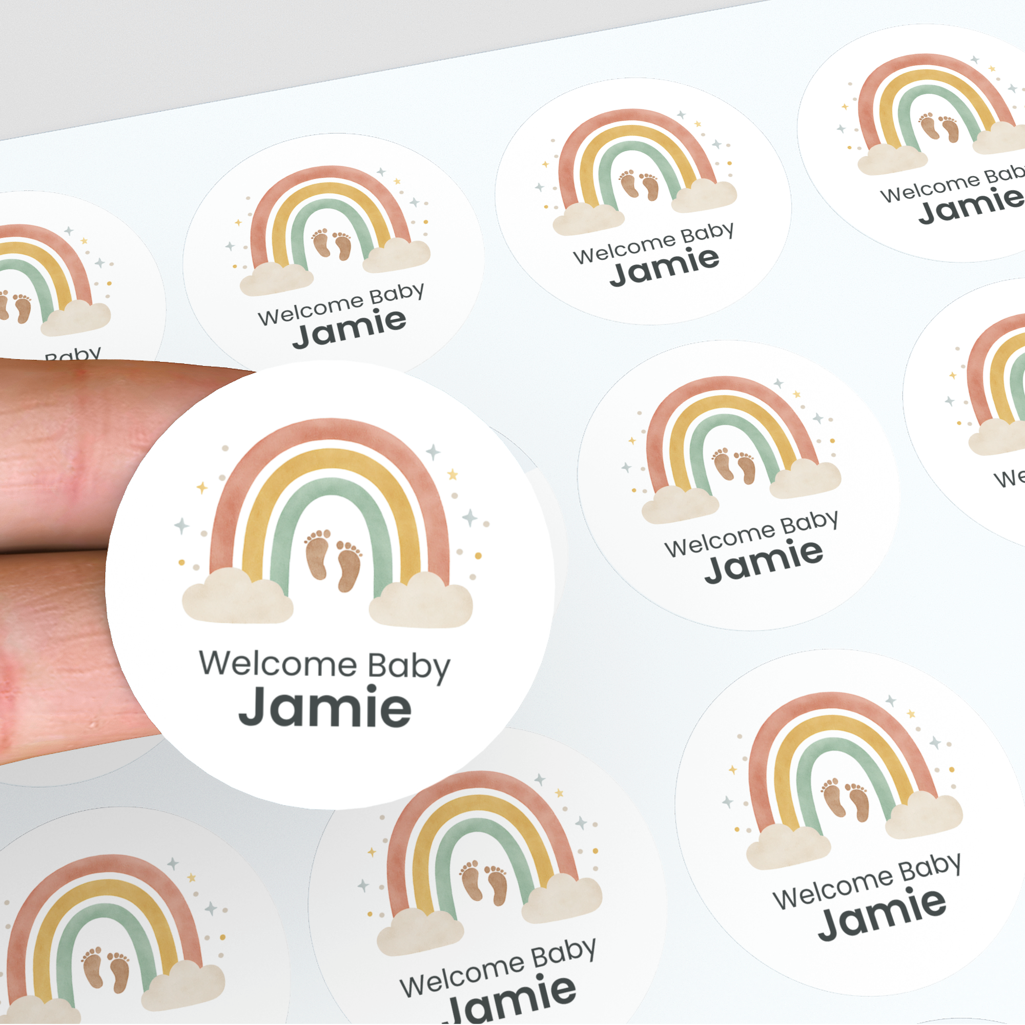 Personalised Welcome Baby Rainbow Stickers with Footprints – Scandi Pastel Gender-Neutral Favour Labels