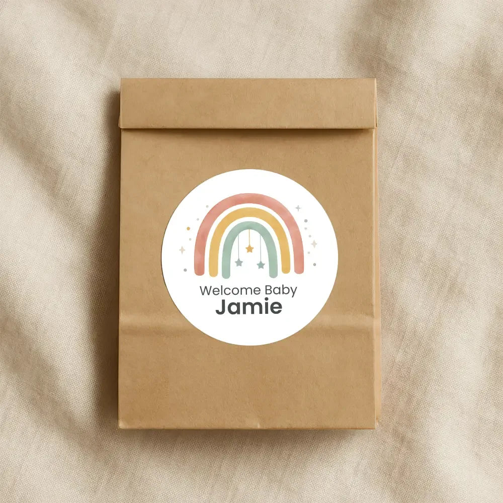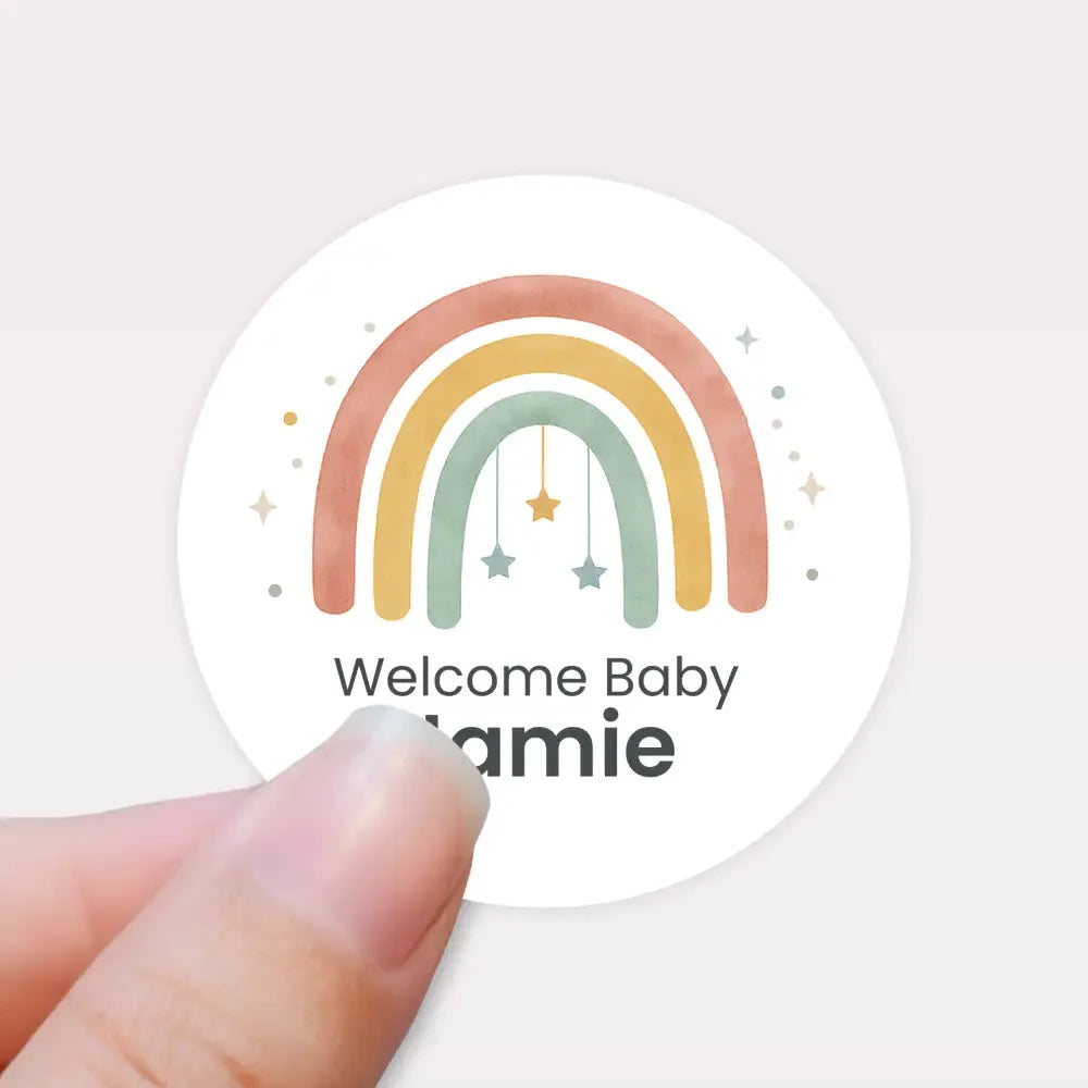 Welcome a little one in the sweetest way with these personalised pastel rainbow stickers. Featuring a soft Scandinavian-style rainbow in muted rose, mustard and sage tones, with adorable hanging stars and scattered confetti dots, this design brings a dreamy, modern and gender-neutral touch to your celebration.