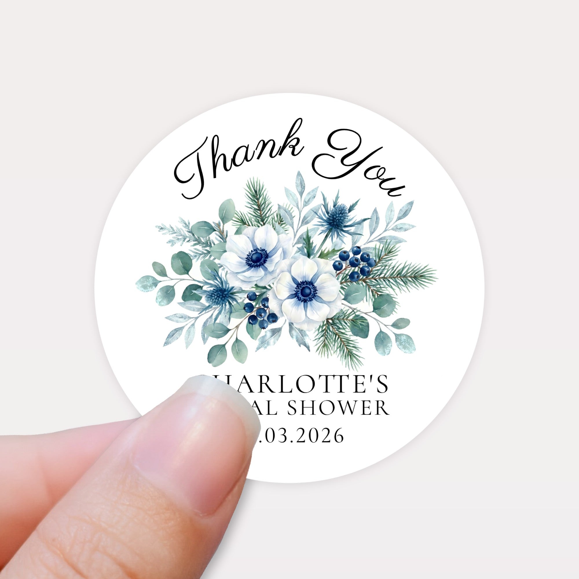 Add a sophisticated winter touch to your bridal shower favours with these personalised blue floral “Thank You” stickers. Featuring elegant watercolour anemones, icy blue greenery, berries and soft pine foliage, this cool-toned botanical design creates a beautifully modern and timeless look.