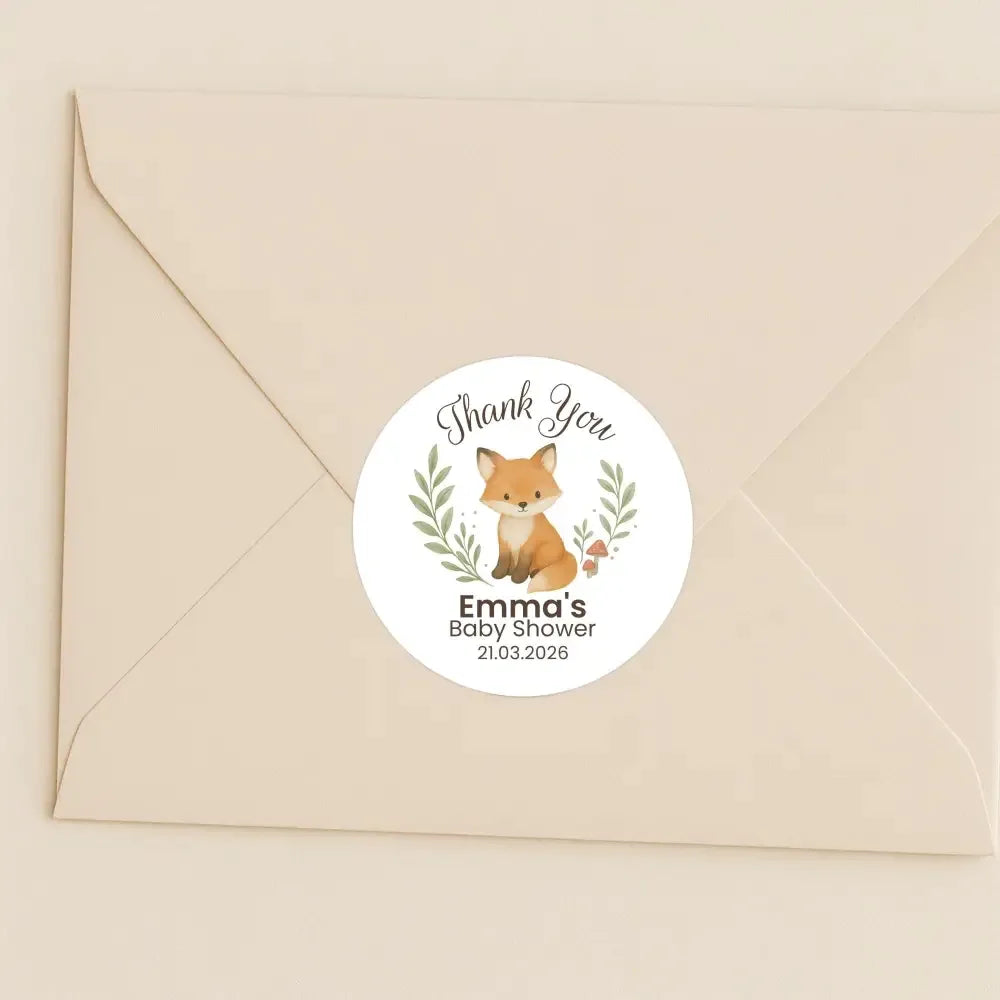 Say thank you in the sweetest woodland style with these personalised fox baby shower stickers. Featuring a hand-painted watercolour fox surrounded by soft greenery, mushrooms and tiny decorative speckles, this charming design adds a warm, rustic and gender-neutral feel to your celebration.