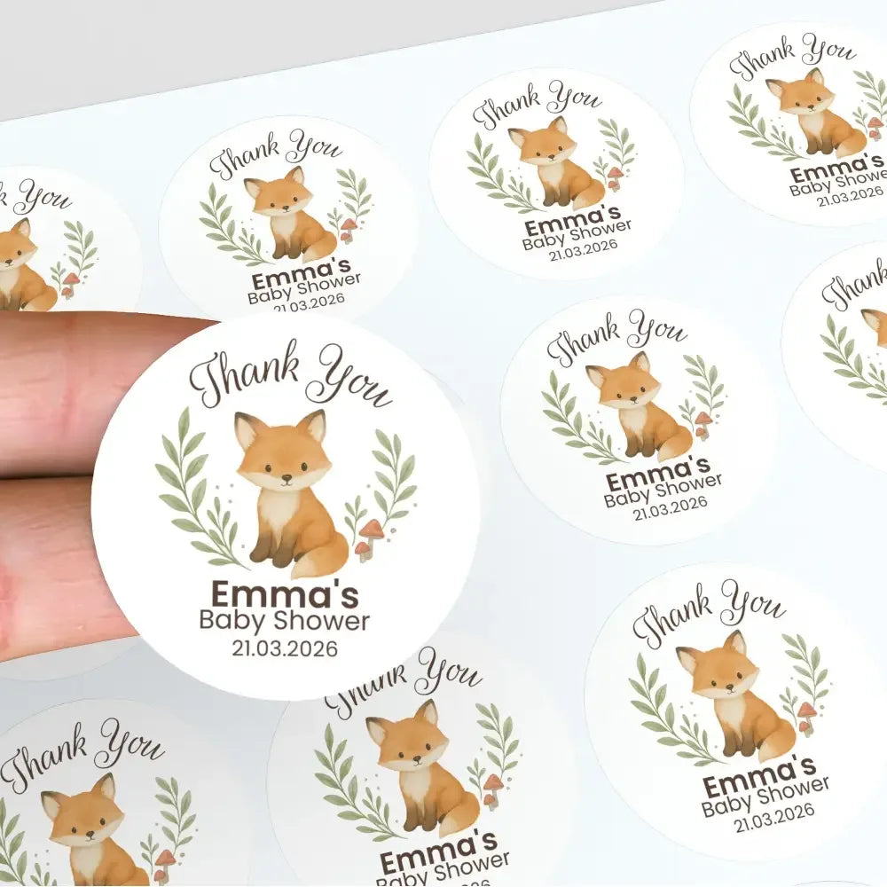Personalised Woodland Fox Baby Shower Thank You Stickers – Watercolour Forest Favour Labels