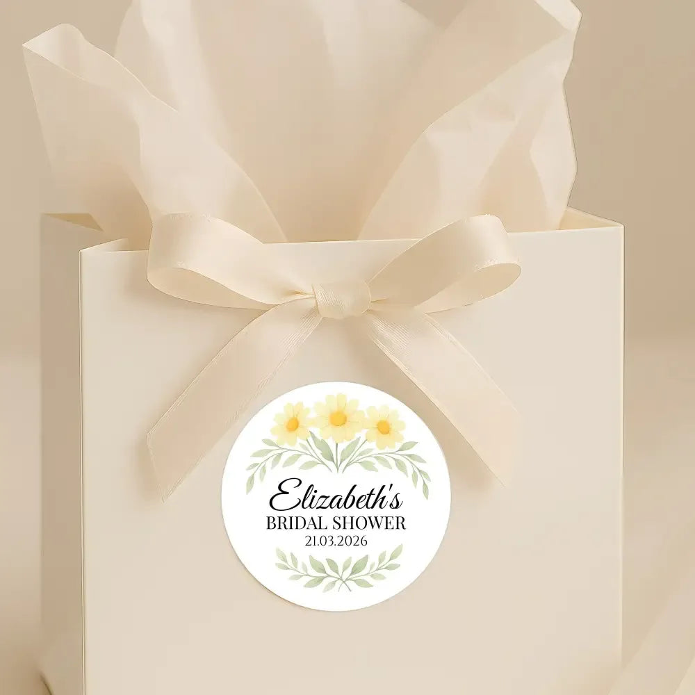 Brighten your bridal shower favours with these personalised yellow daisy bridal shower stickers. Featuring soft watercolour daisies in cheerful pastel yellow paired with elegant sage green leaves, this fresh and uplifting design adds a sweet, feminine touch to any celebration.