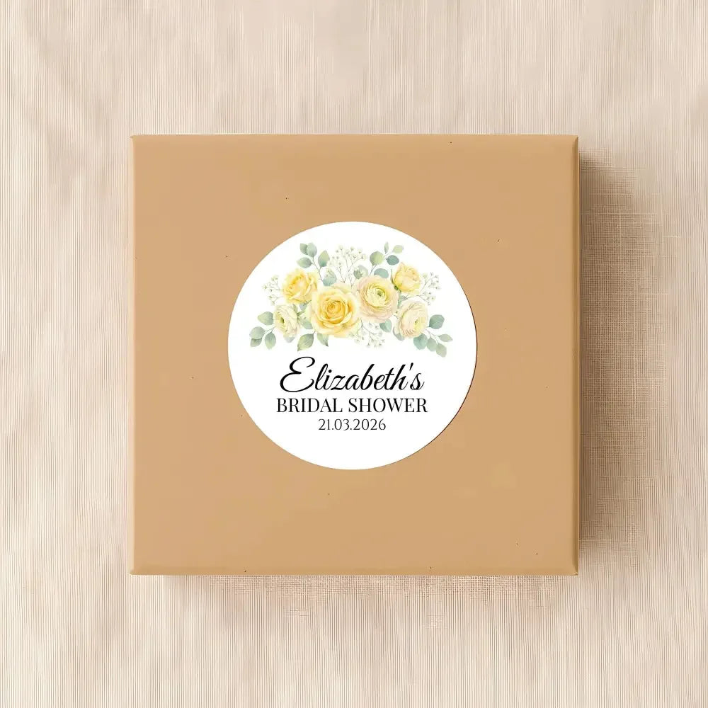 Personalised Yellow Rose Bridal Shower Stickers – Custom Name & Date – Watercolour Floral Favour Labels