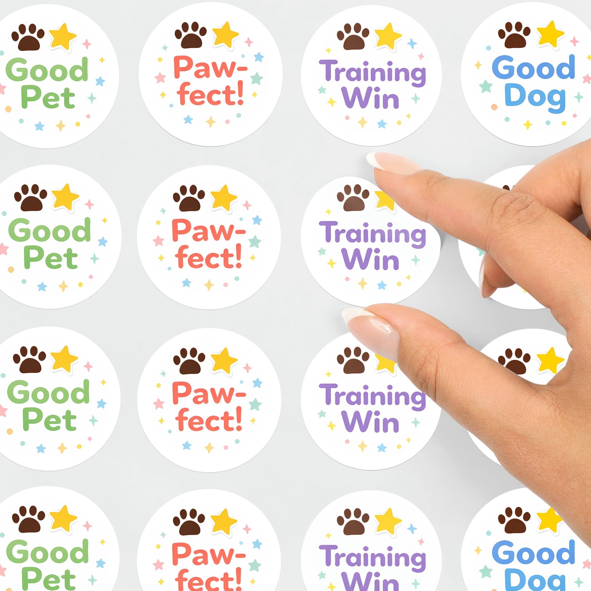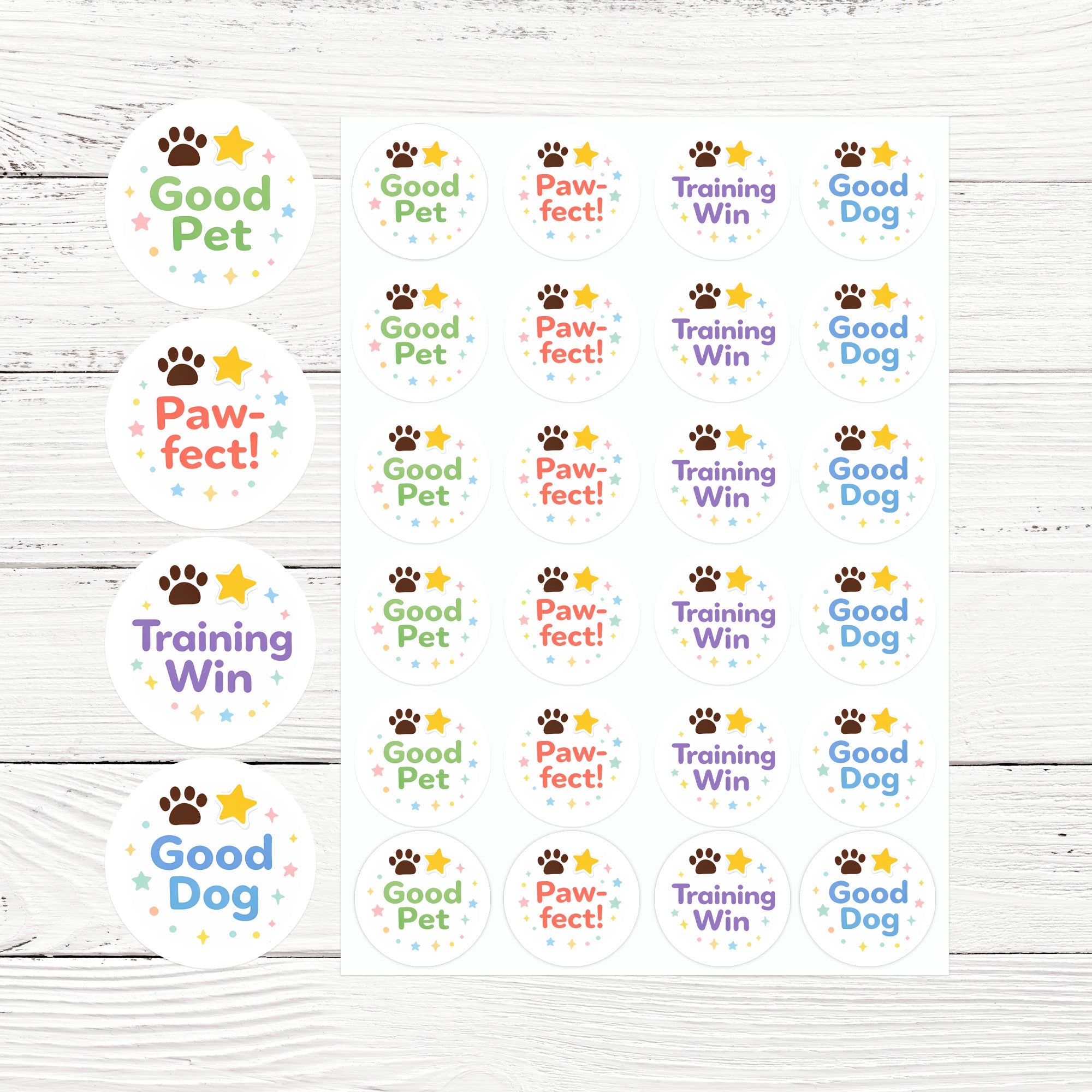 Featuring playful typography, cheerful stars, and paw-print icons, these stickers include uplifting phrases such as “Good Dog”, “Good Pet”, “Paw-fect!” and “Training Win”, perfect for reinforcing good behaviour with positivity and praise.