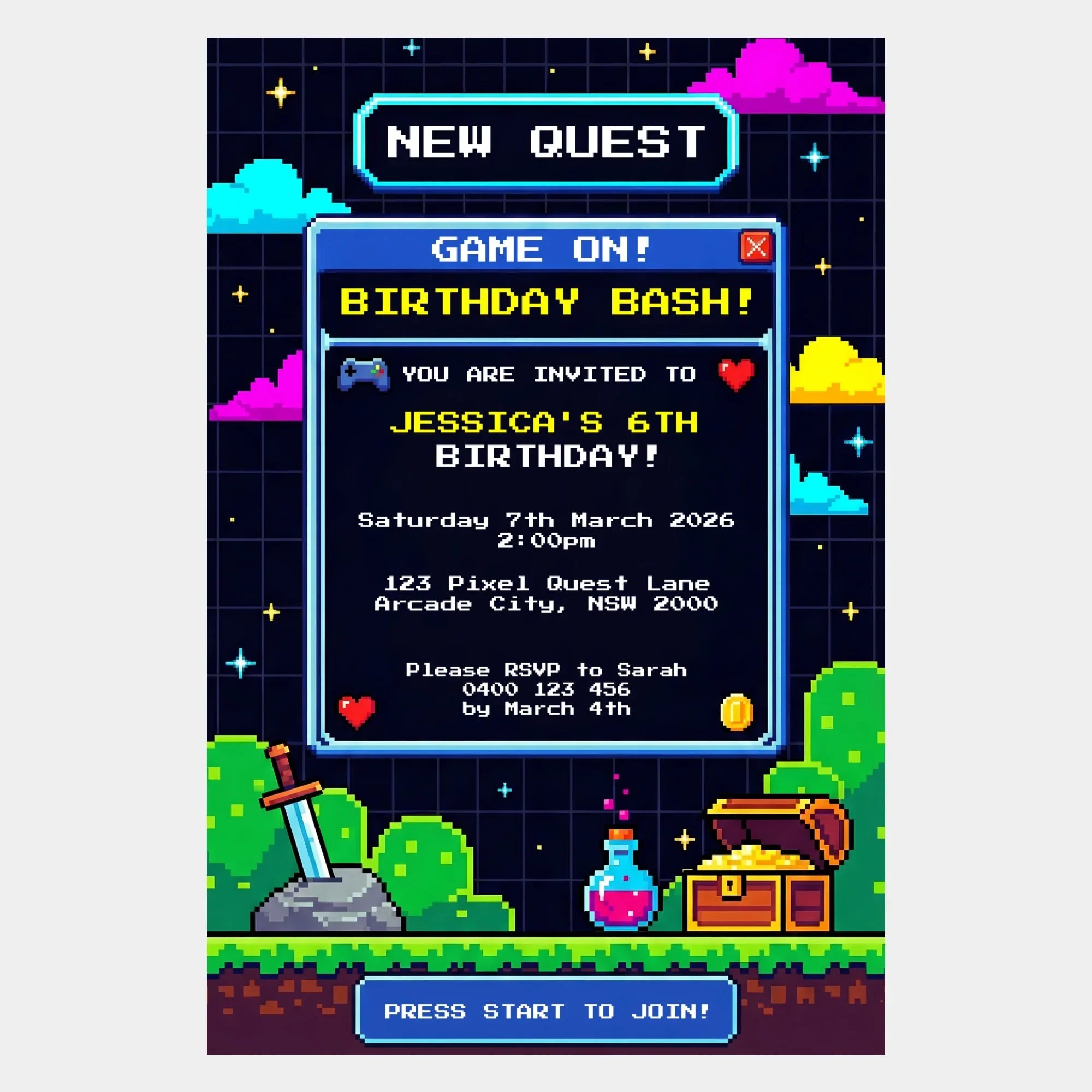 Fun, energetic, and game-ready, this pixel game birthday invitation is the perfect way to start an epic party quest.