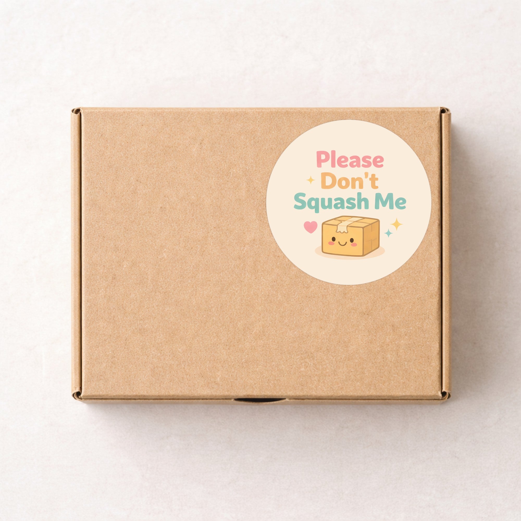 Featuring a happy illustrated parcel with soft pastel lettering and playful sparkle accents, these stickers communicate do not squish in a warm, non-industrial way — perfect for small businesses that want protection without harsh warning labels.