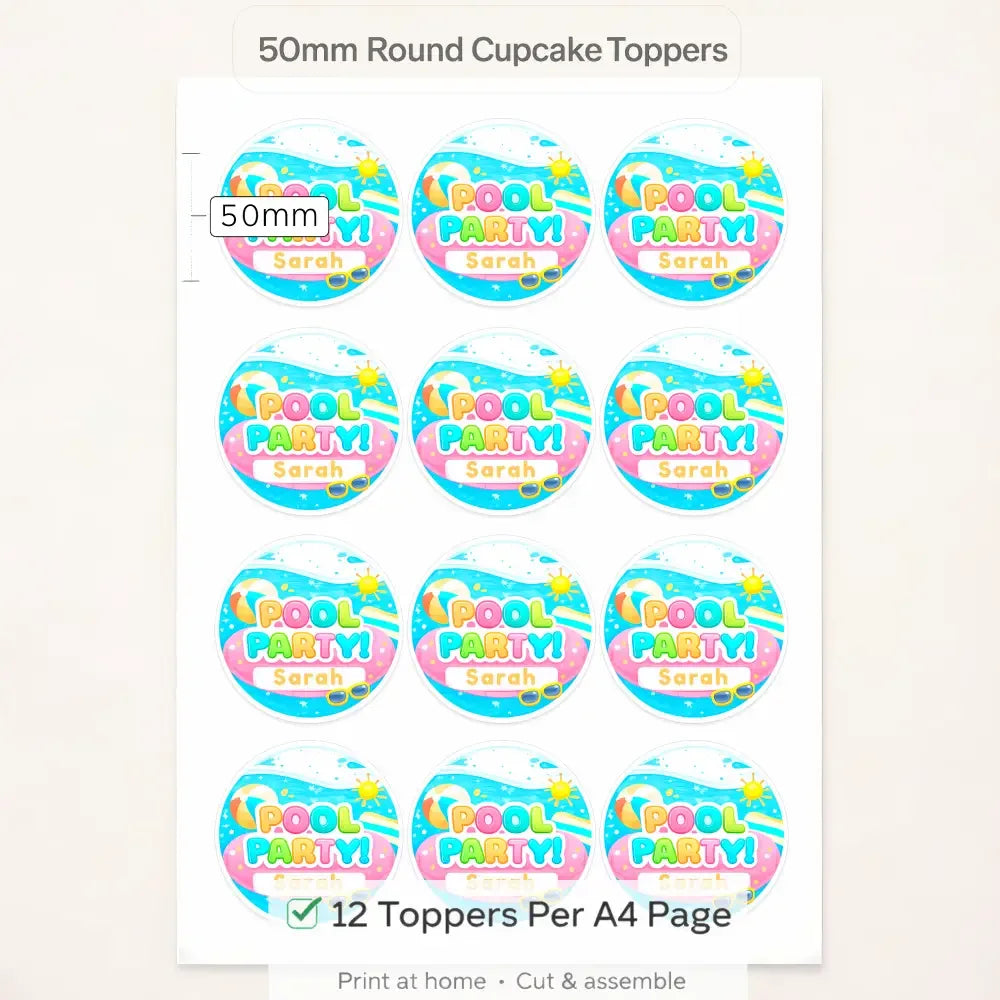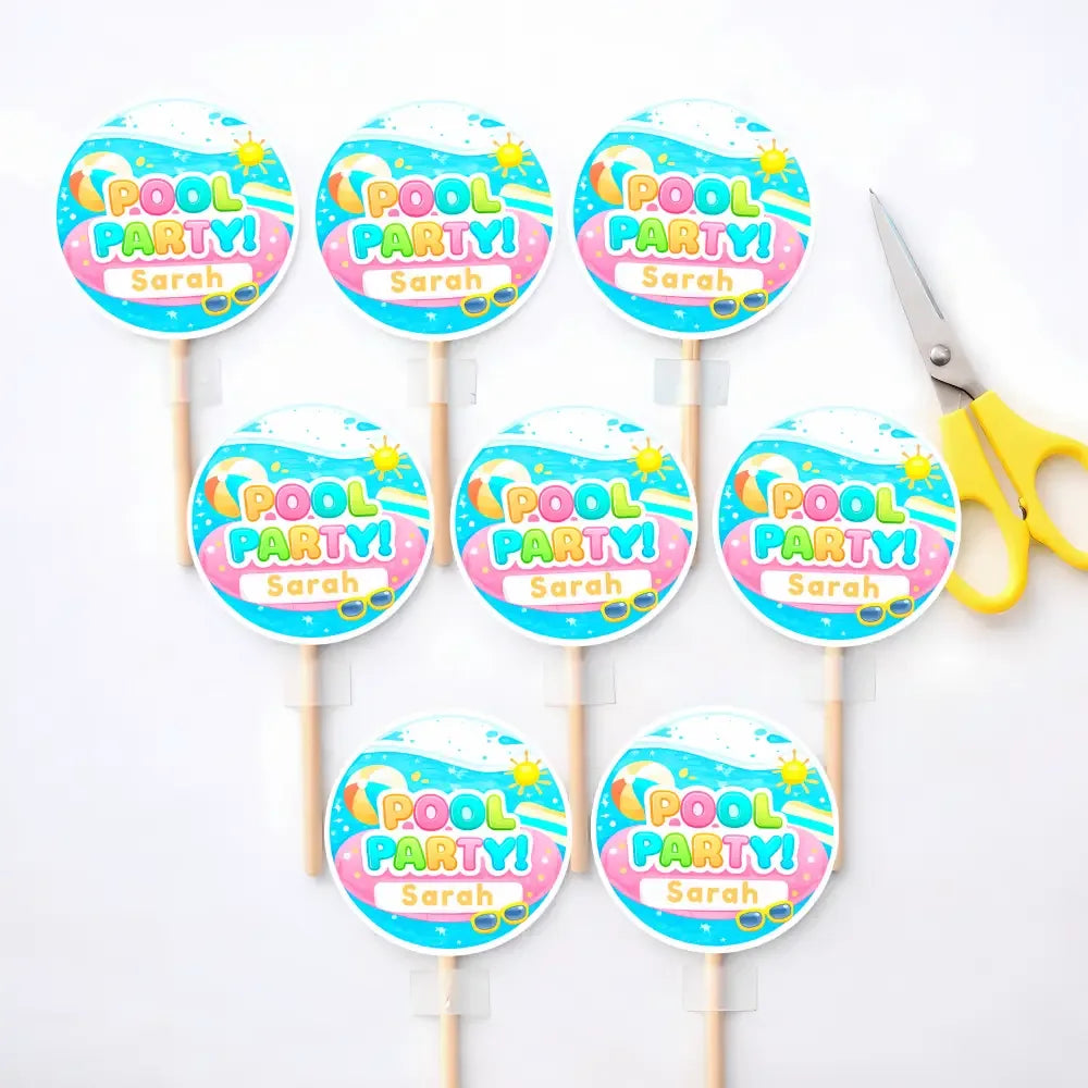 Designed with a playful pool-water theme, summer icons, and cheerful pastel colours, these cupcake toppers are perfect for kids’ birthdays, pool parties, and warm-weather celebrations.