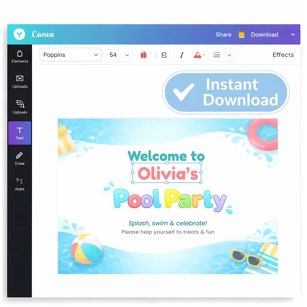 The illustrated pool party background, colours, and graphics are fixed for a polished, professional look. You can easily edit the child’s name and wording details (such as welcome text or party message) in Canva. The design layout remains unchanged so your sign always looks cohesive and high quality.