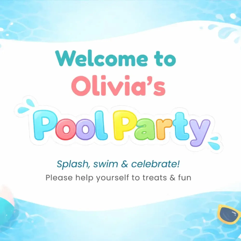 Designed with a colourful pool party theme featuring playful pool water waves, splashes, and summer-style graphics, this sign is perfect for welcoming guests, decorating a party table, or displaying at the pool party entrance.