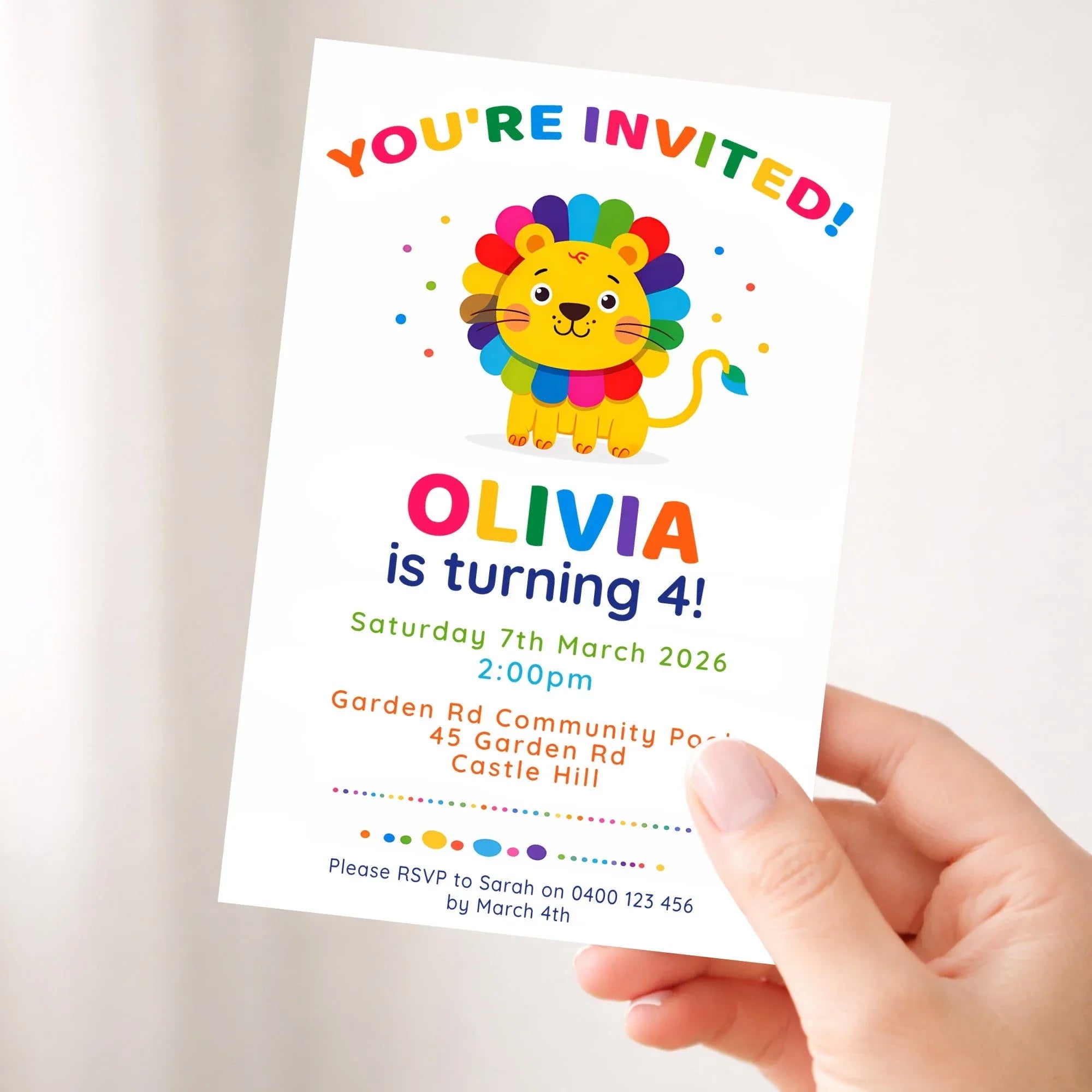 Rainbow Lion Birthday Invitations | Personalised Kids Party Invites | 4×6 Printed