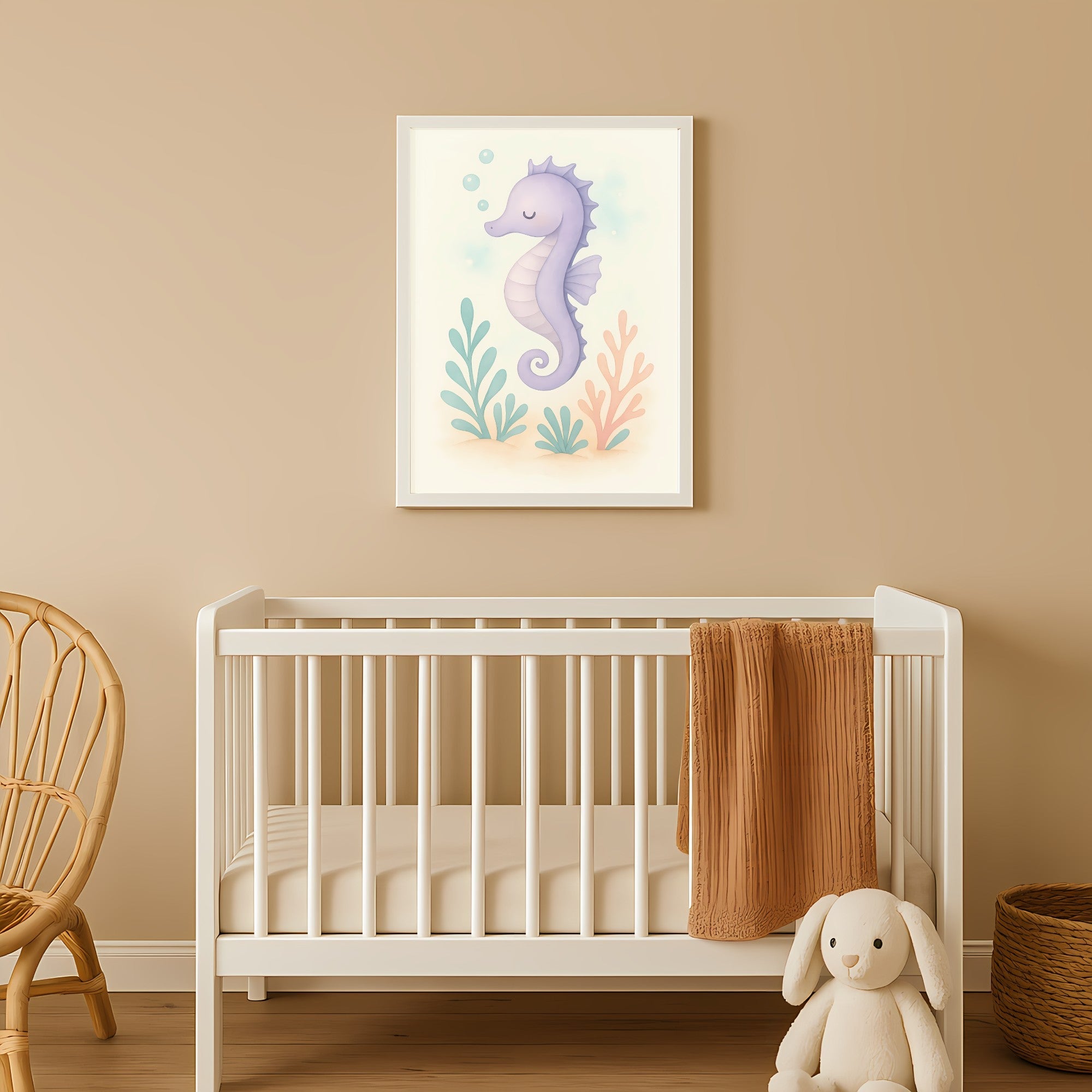 Add a peaceful coastal touch to your nursery with this Little Seahorse Nursery Wall Art Print, featuring a gentle lavender seahorse floating gracefully among coral and sea plants.