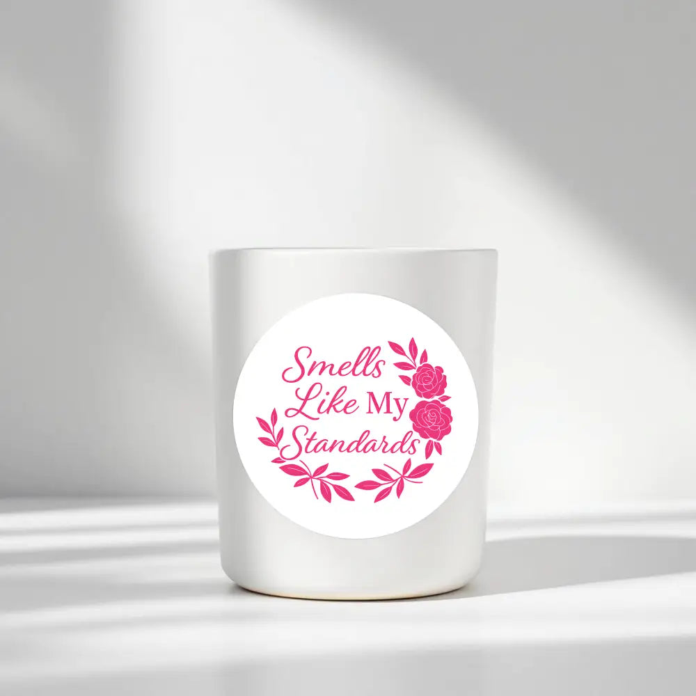 This “Smells Like My Standards” sticker features bold hot pink florals and a chic cursive font — perfect for confident, classy candle collections with a cheeky twist. Designed to empower, inspire, and decorate your self-care or breakup candle jars with a pop of feminine sass.
