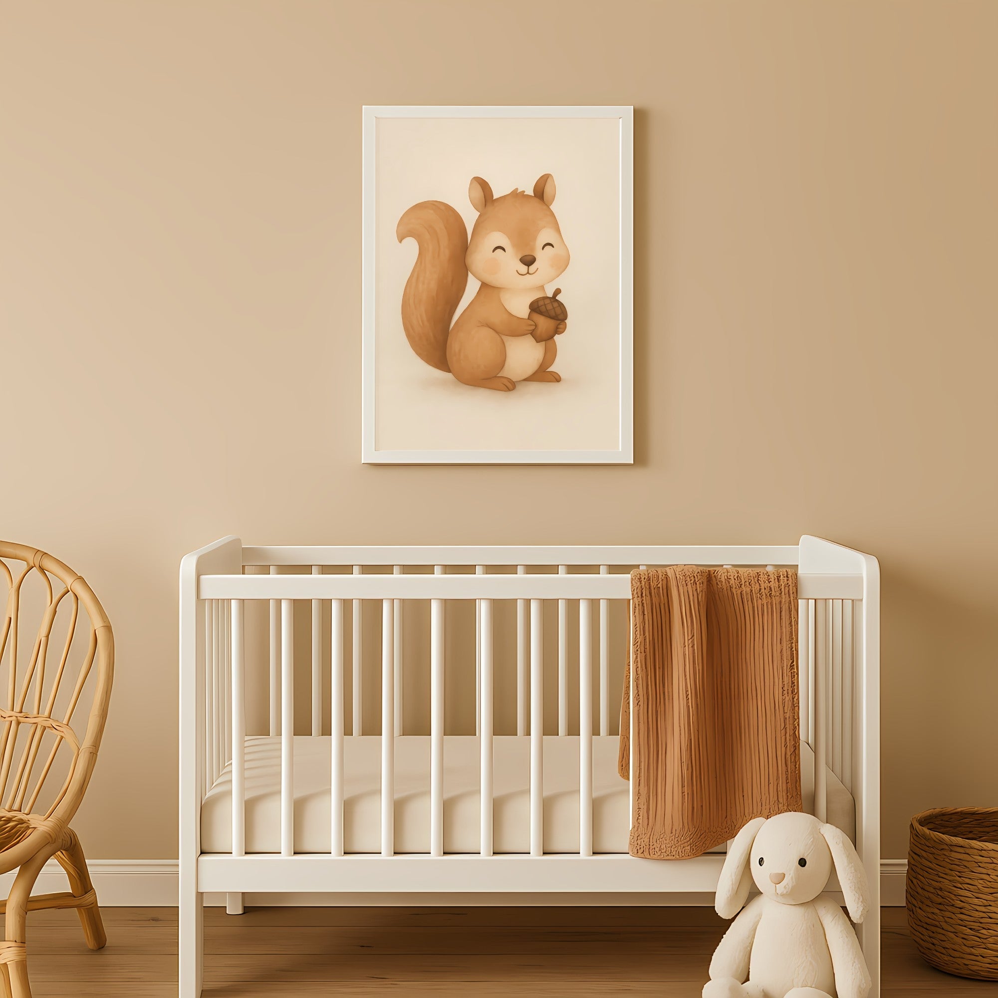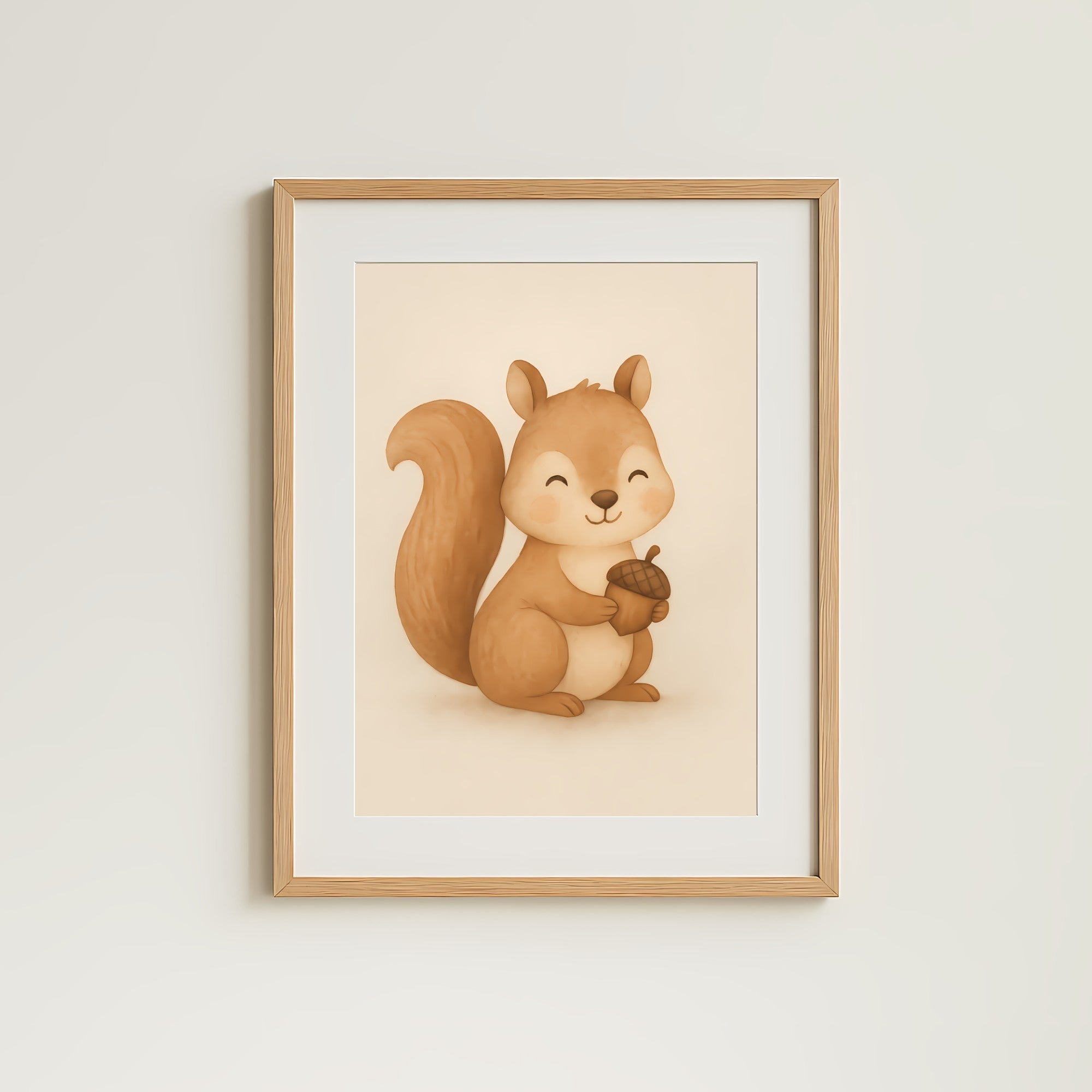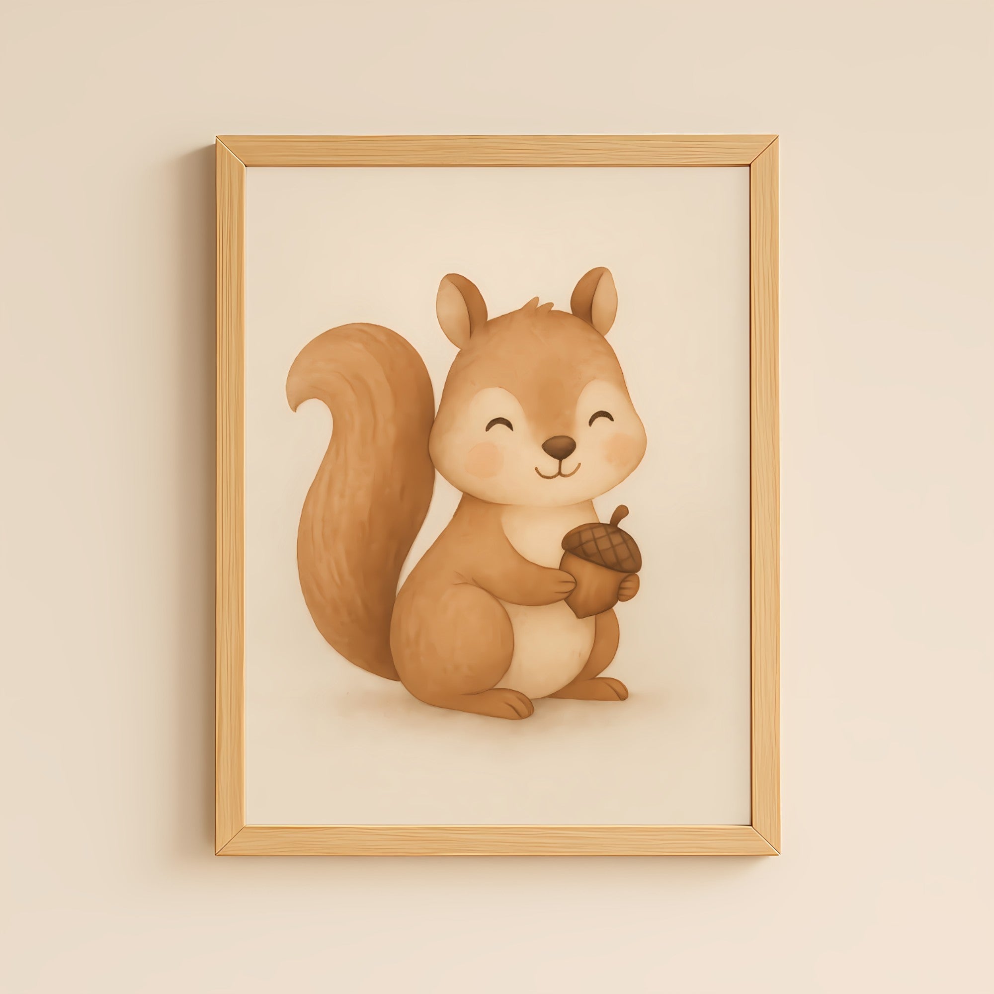 Add a touch of woodland warmth to your nursery with this Little Squirrel Nursery Wall Art Print, featuring a happy squirrel holding an acorn in soft earthy tones.