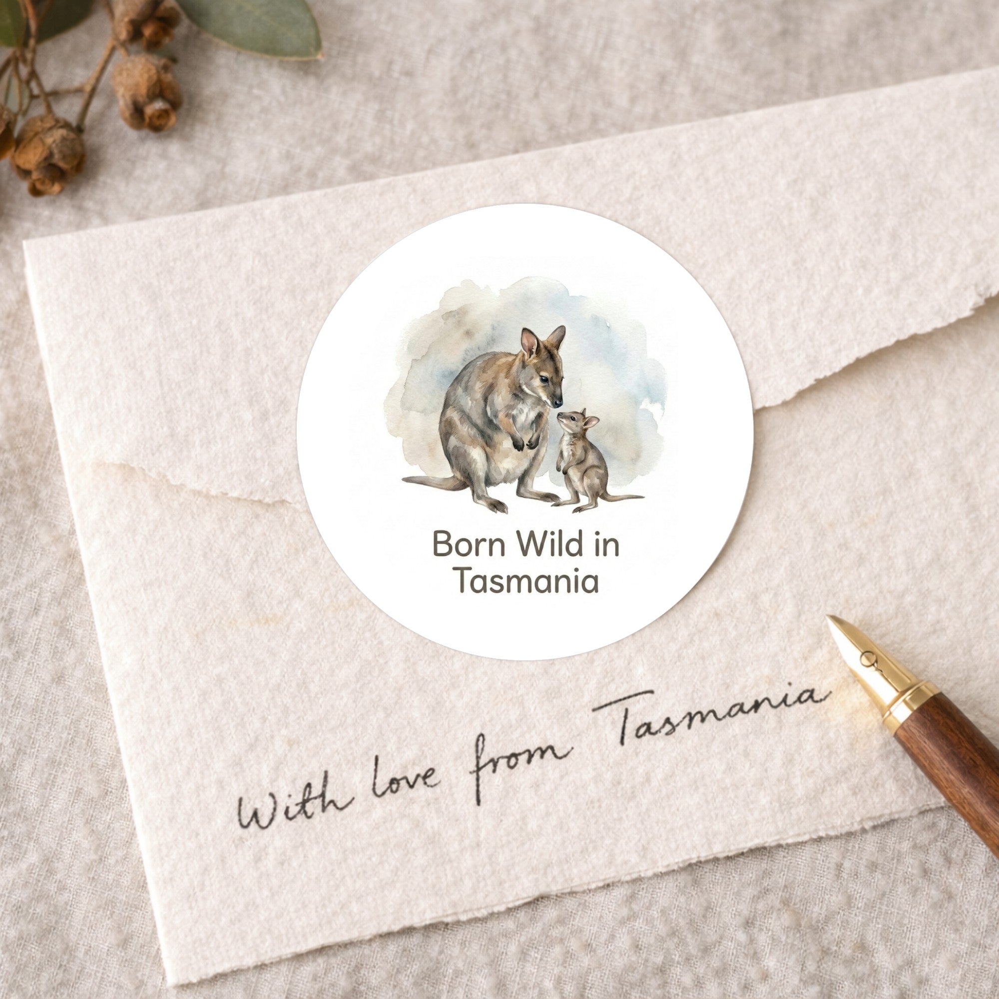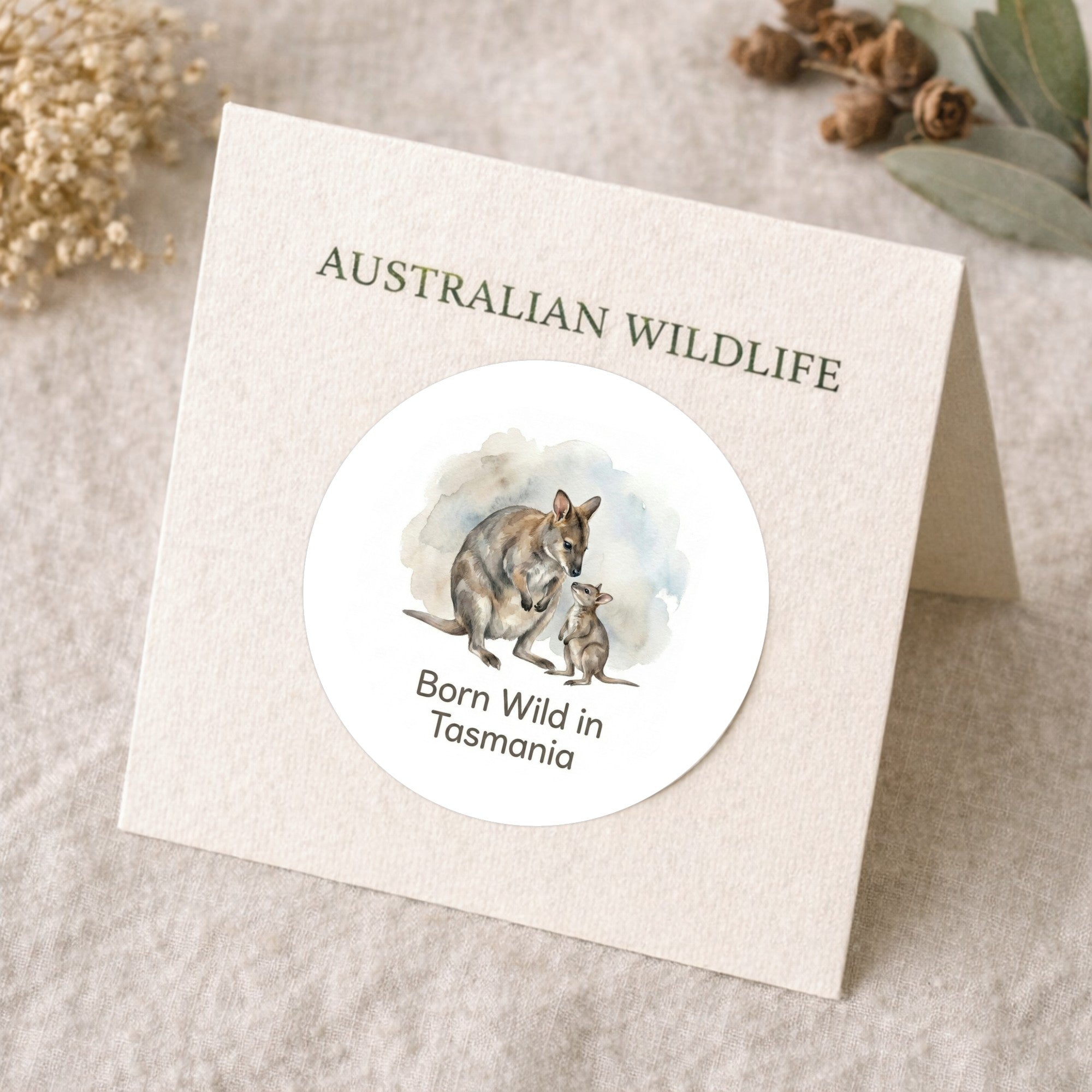 Celebrate one of Tasmania’s most beloved native marsupials with this beautiful “Born Wild in Tasmania” Tasmanian pademelon round sticker. Featuring a gentle watercolour illustration of a mother pademelon and her joey sharing a quiet moment, this design captures the warmth, protection, and connection found in the wild.