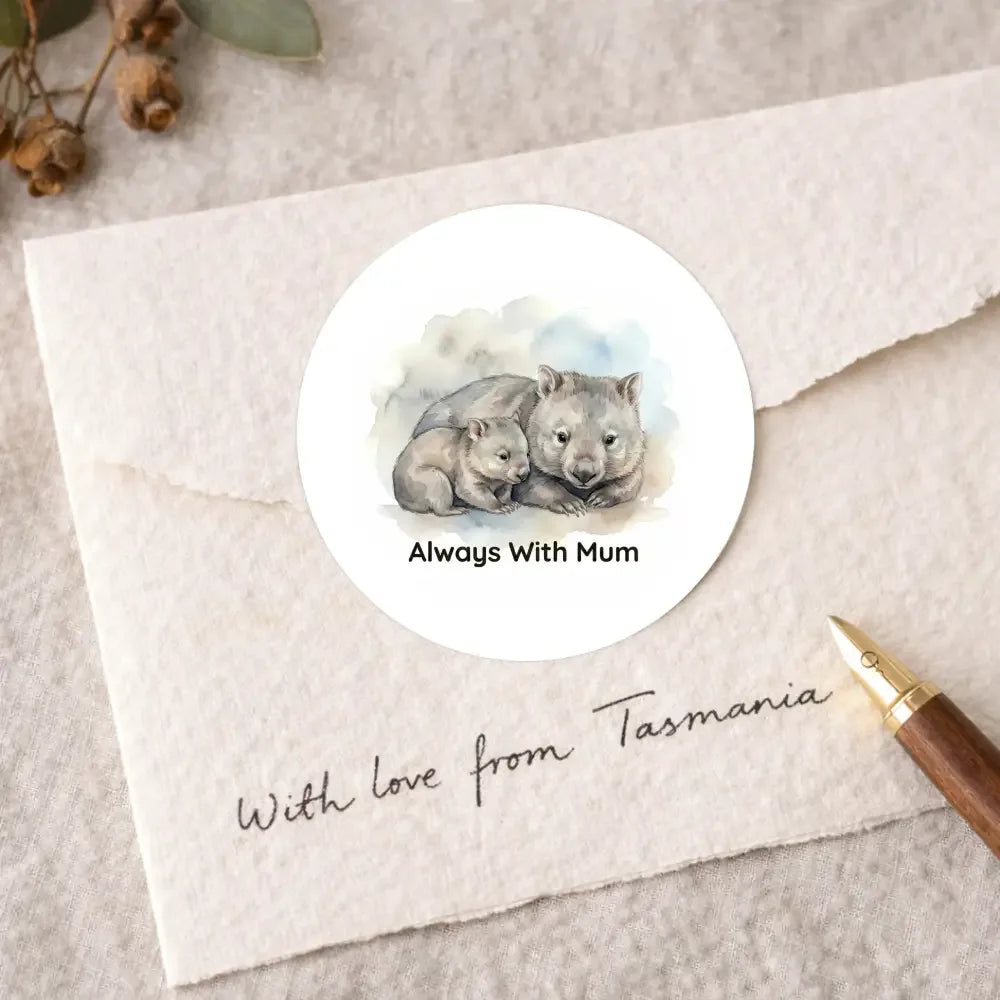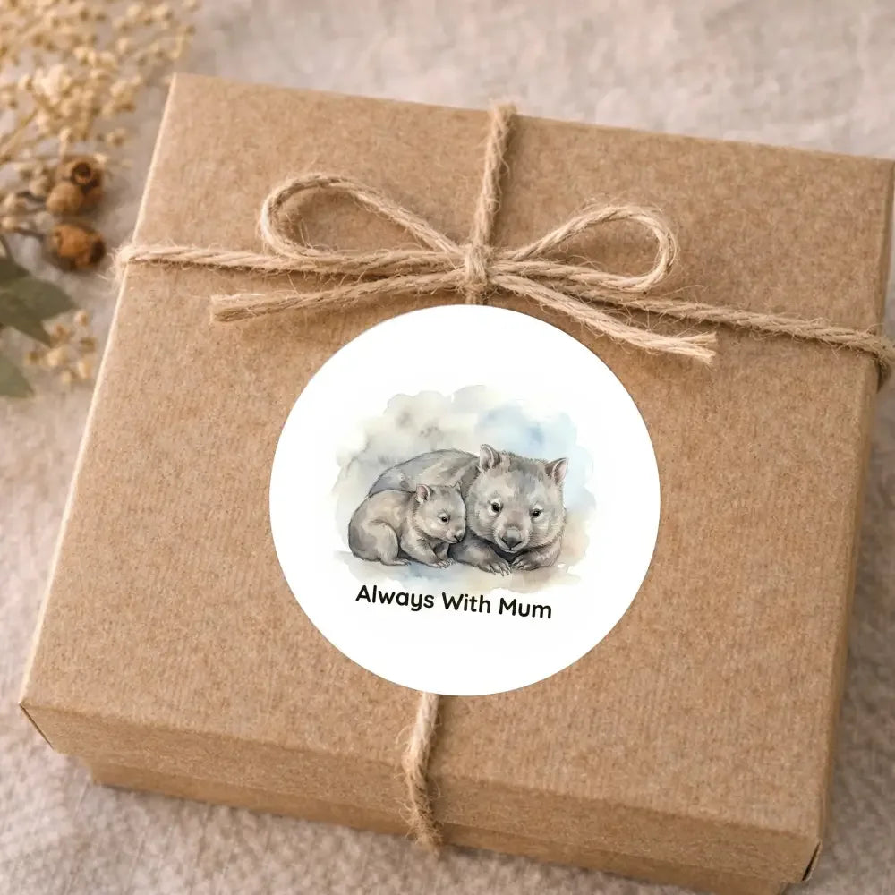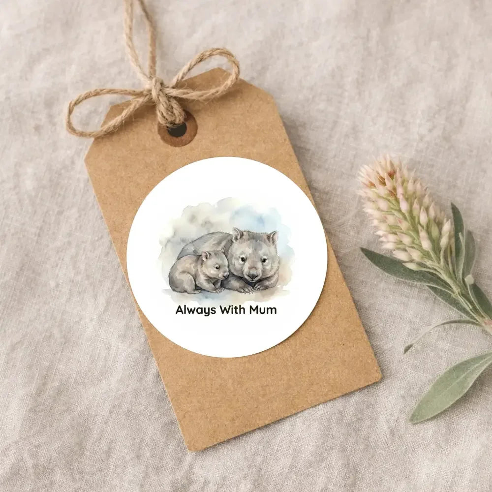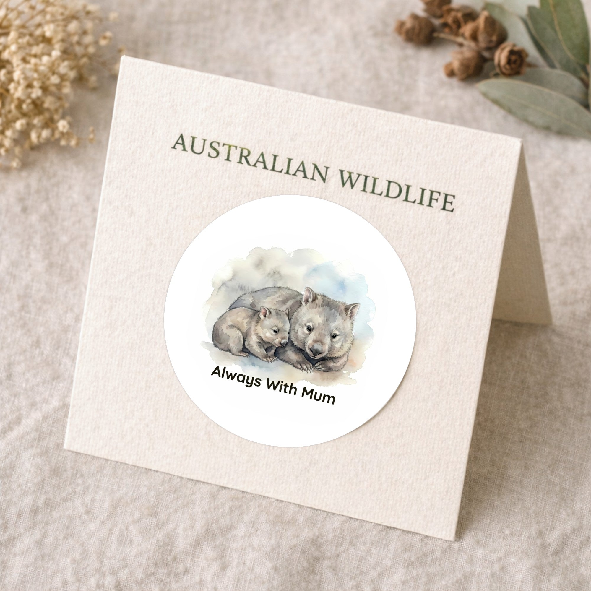 Celebrate the unbreakable bond between mother and child with this tender “Always With Mum” wombat round sticker. Featuring a gentle watercolour illustration of a wombat mother resting protectively beside her joey, this design captures warmth, safety, and unconditional love.