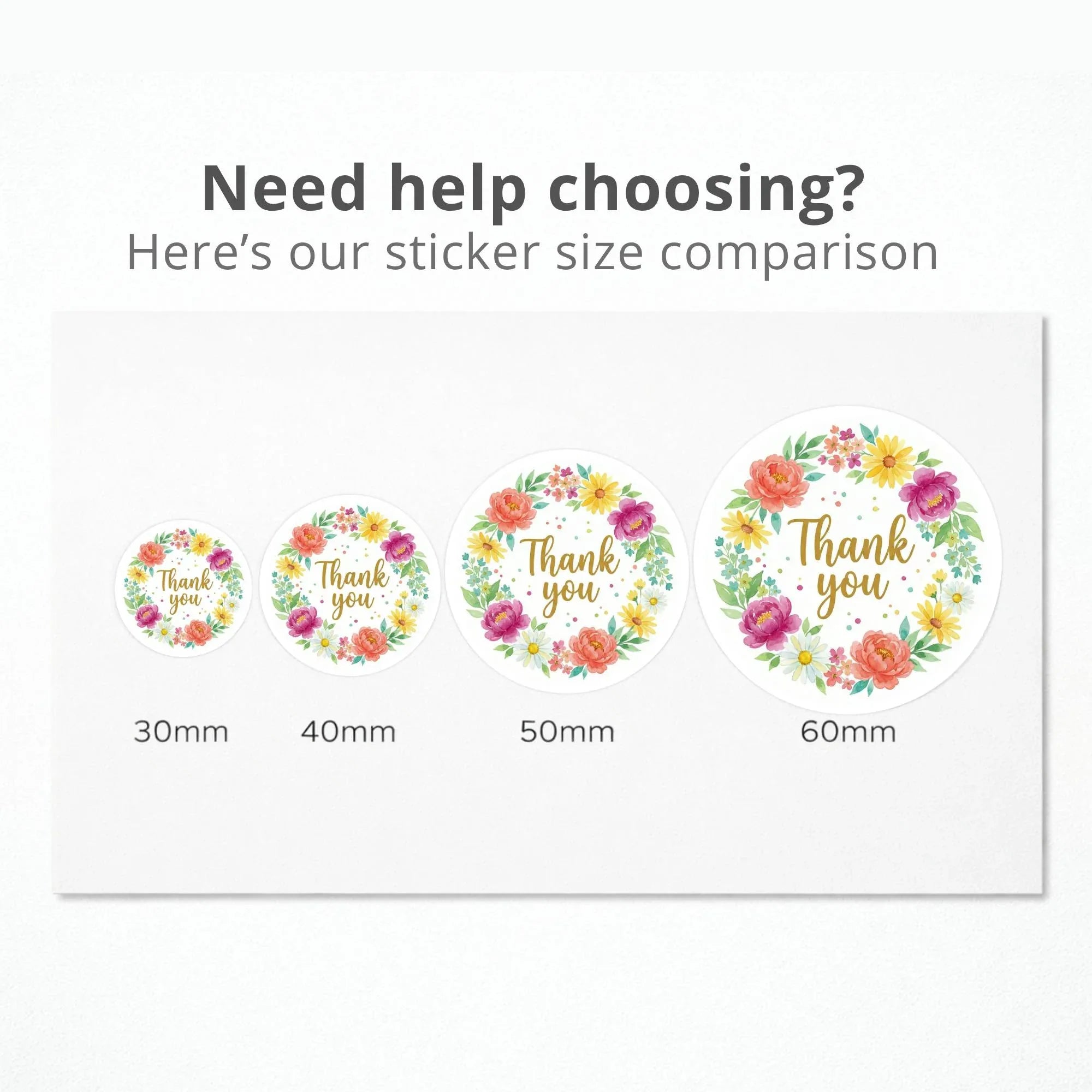 Each sheet includes the same “Thank You” floral wreath design, printed in your selected size and finish.