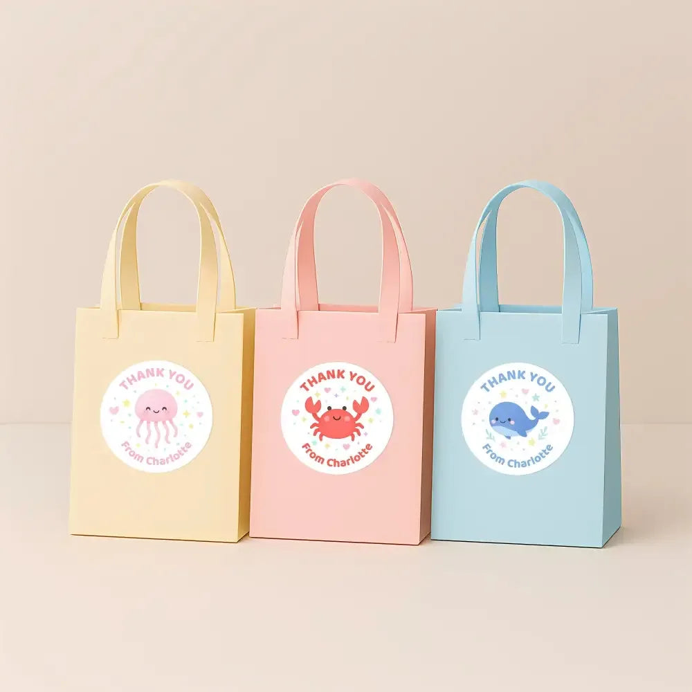 Make your party favours extra adorable with this cute Under the Sea Thank You Sticker Set! Featuring four pastel ocean friends — a happy starfish, a sweet jellyfish, a friendly whale, and a cheerful crab, these personalised stickers add the perfect finishing touch to party bags, boxes, jars and gifts.