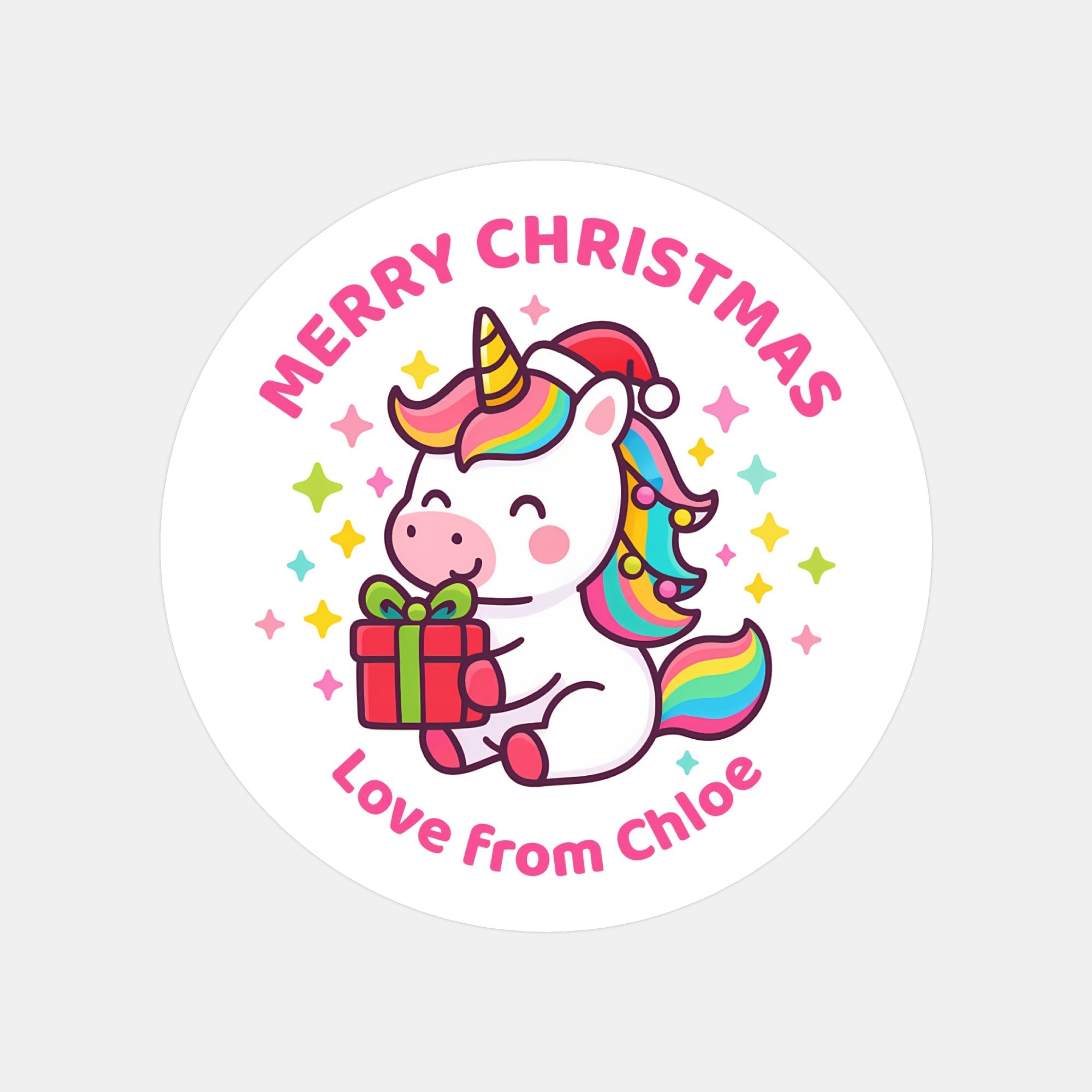 Make Christmas extra cute with our Personalised Unicorn Christmas Stickers, featuring a rainbow unicorn holding a festive present. Perfect for kids’ gift bags, daycare treats, Christmas Eve boxes, party favours and presents under the tree.