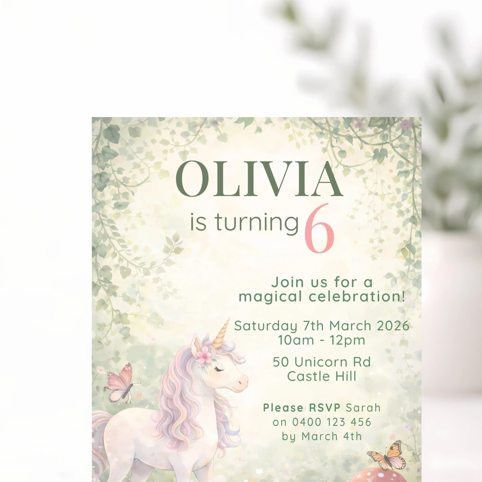This enchanting design features a graceful unicorn surrounded by soft greenery, delicate florals, butterflies, and whimsical woodland details. With its gentle pastel tones and storybook forest setting, this invitation is perfect for children who love unicorns, fairy gardens, and nature-inspired magic.