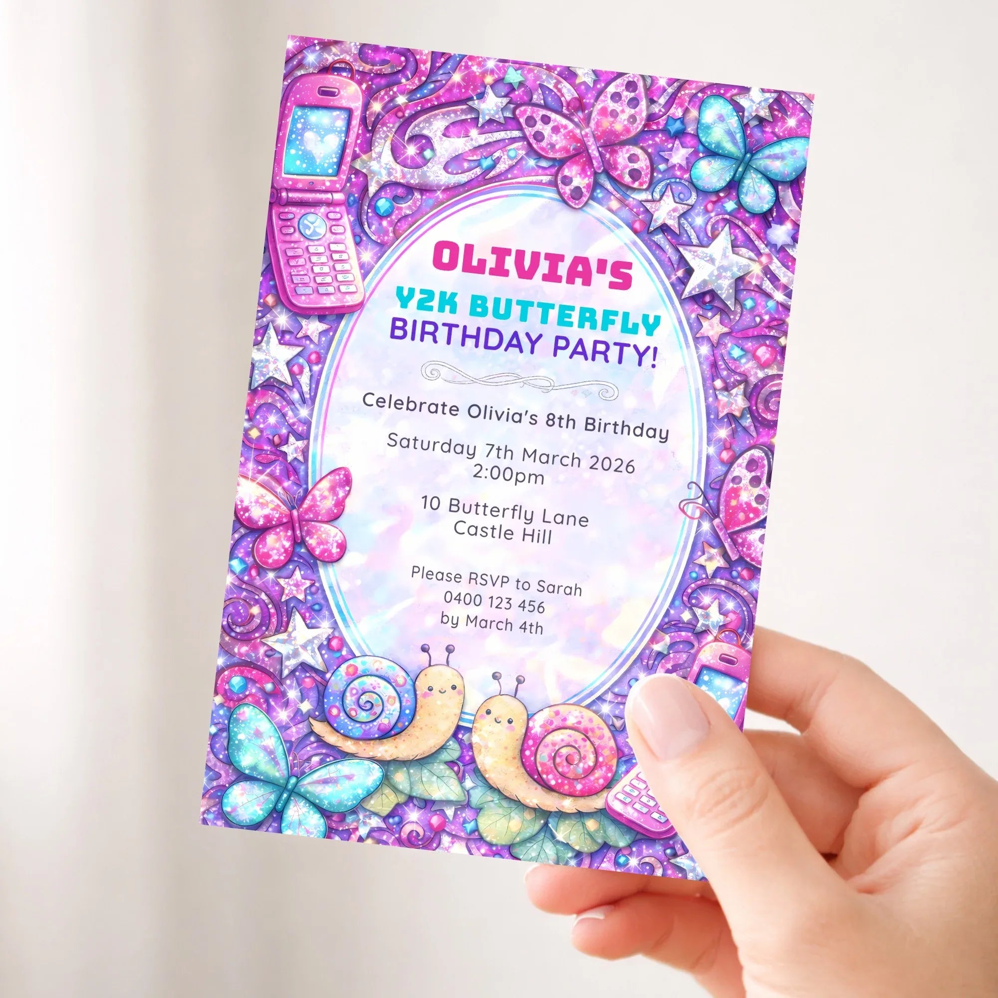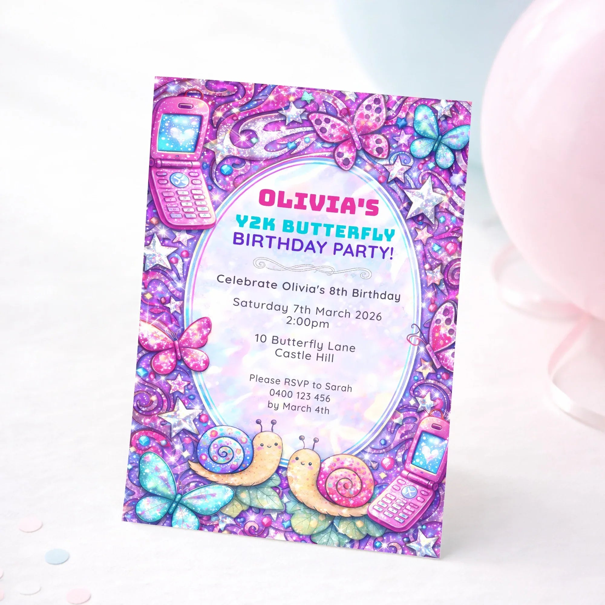Bright, bold, and full of early-2000s sparkle, this Y2K butterfly birthday invitation is perfect for a fun and fashionable celebration.